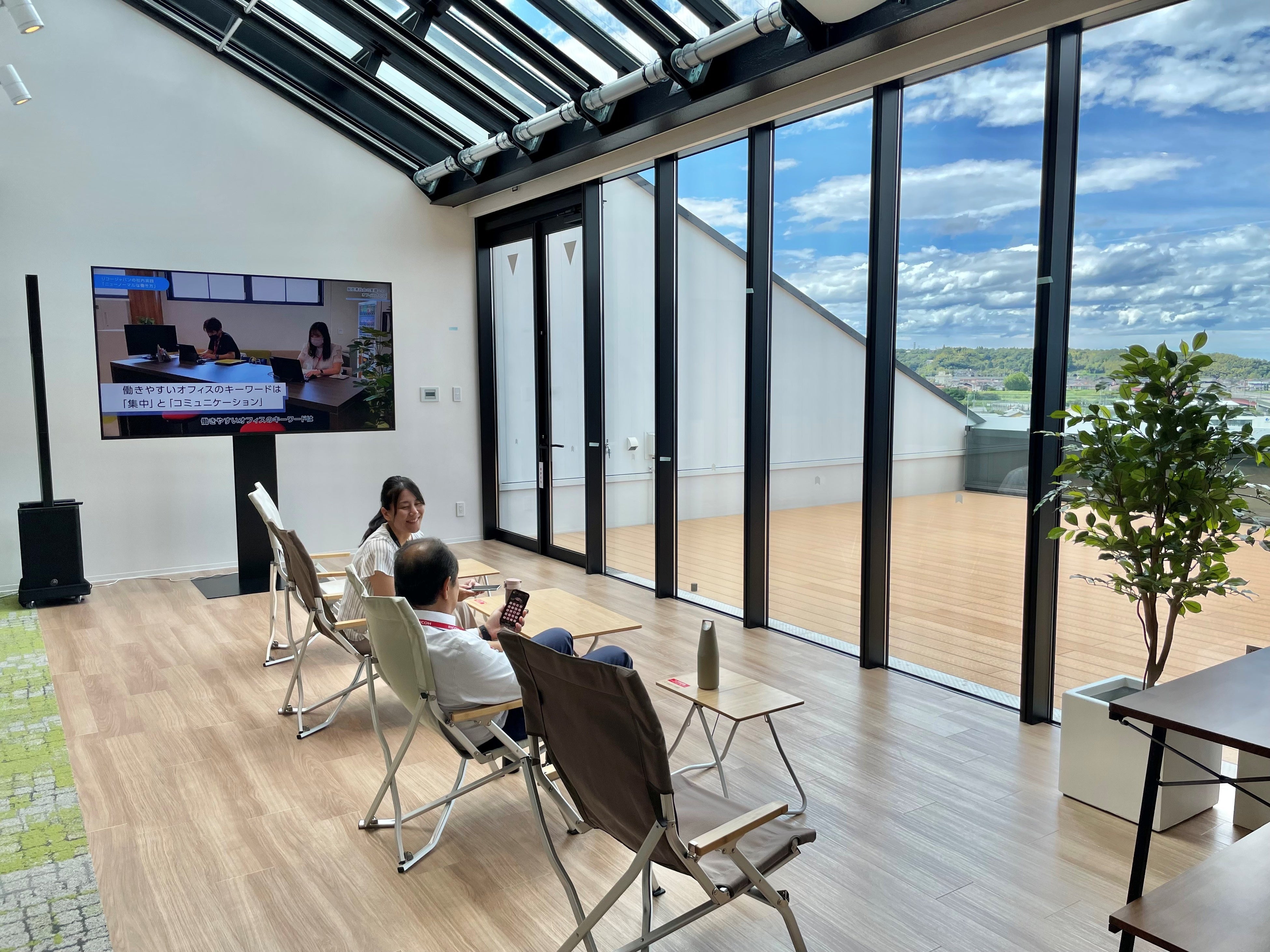 オフィスビルには珍しいテラスもあり、社員のリラックス空間となっています。お越しいただいたお客様にも富山市内の景観を楽しんでいただけます。