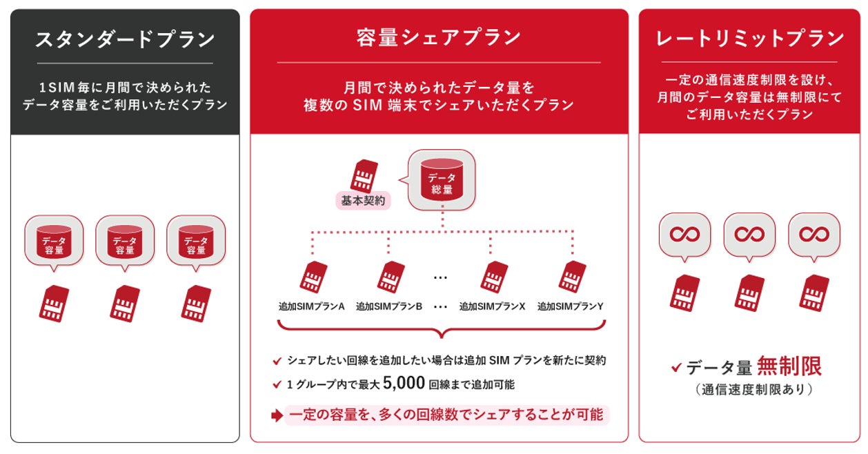 新たに追加する「容量シェアプラン」は、1グループ内で契約したデータ容量を複数のSIM端末でシェアできるほか、月間最大100GBまでの大容量通信にも対応しています。また「レートリミットプラン」は、月間のデータ通信量に関わらず常時最大3Mbpsの通信速度で利用できるため、データ通信量を気にせず安定した通信環境を求めるお客様に最適です。これらの新プランを通じて、多様化するモバイル通信環境のニーズに応えてまいります。