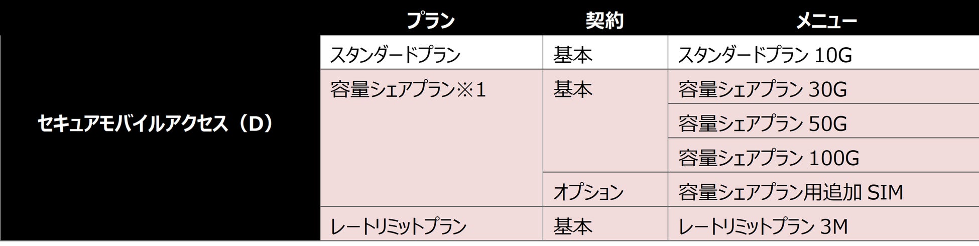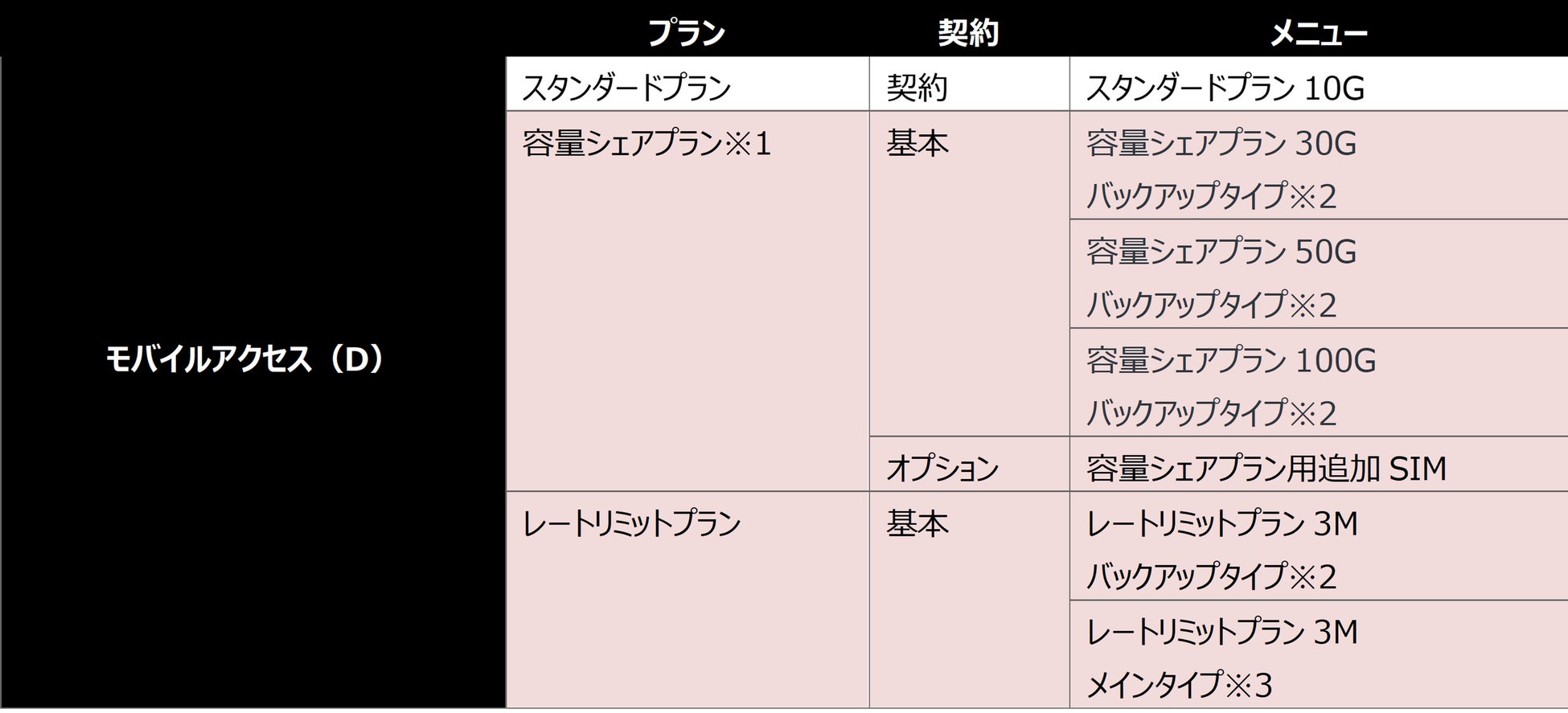「セキュアモバイルアクセス(D)」、「ブロードバンドモバイルアクセス(D)」、「モバイルアクセス(D)」では、1SIM毎に利用可能な容量が設定されているスタンダードプランに加え、以下の2つのプランを追加しました。