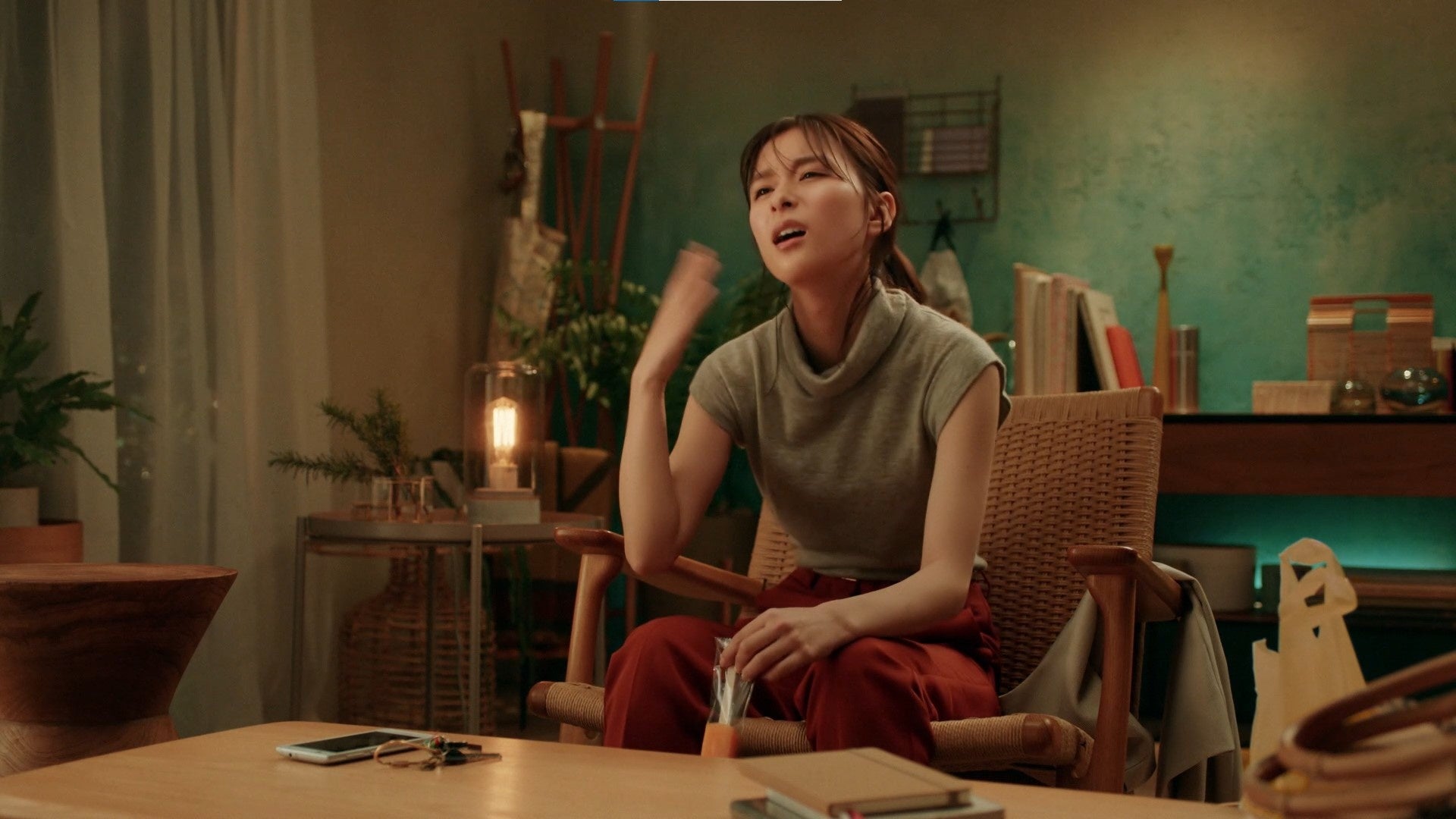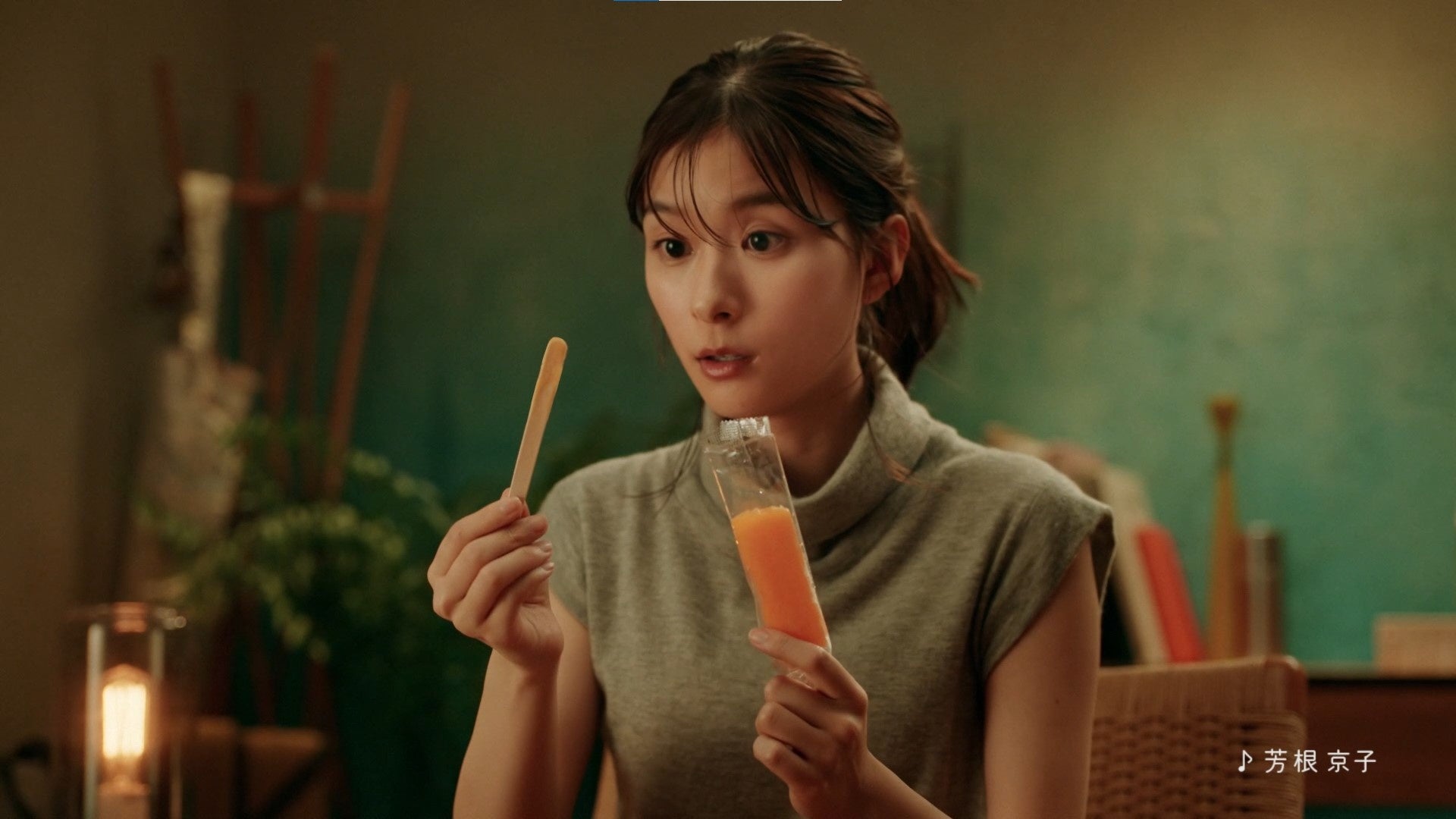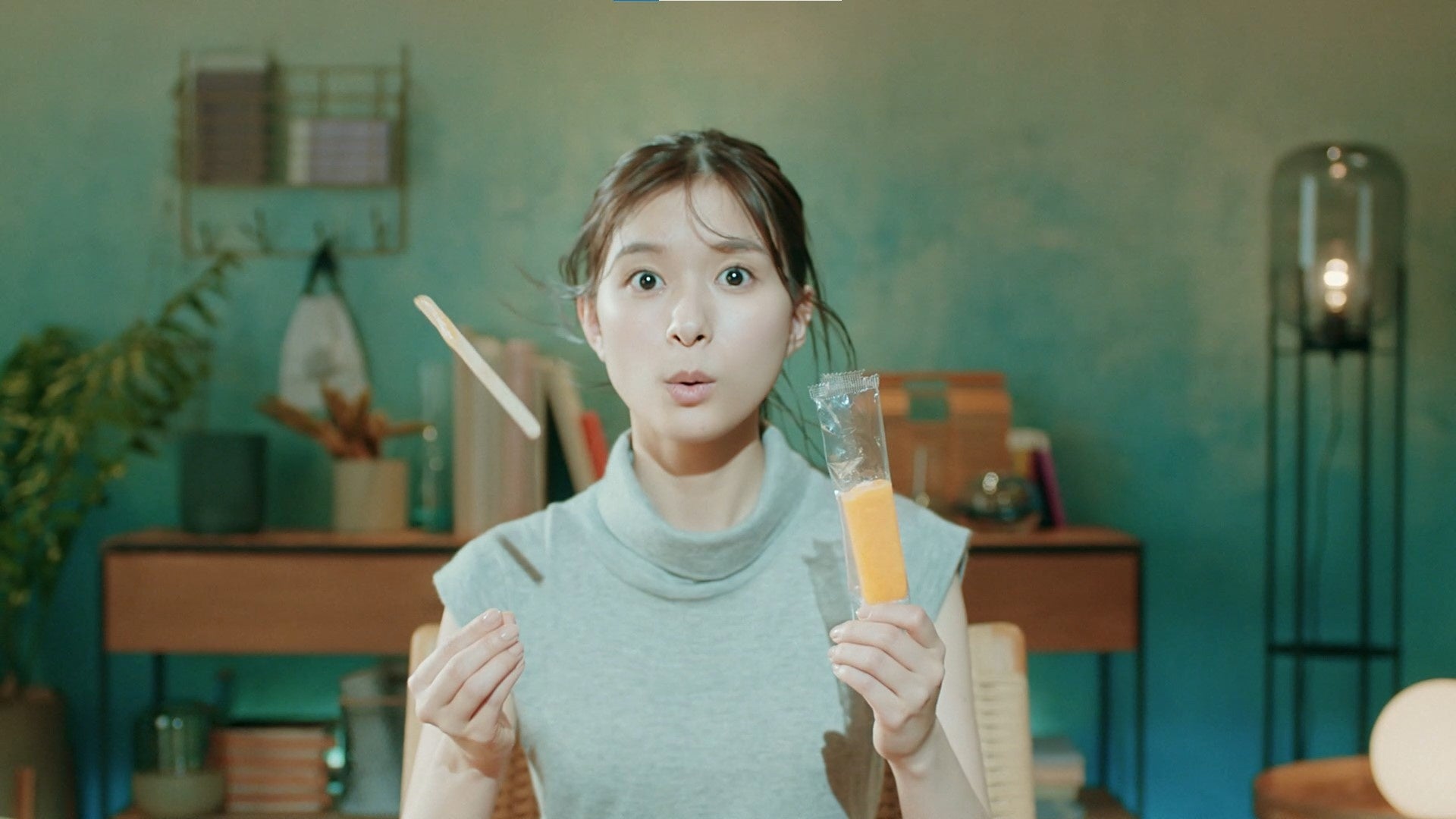 夏の暑い日に芳根さんがアイスを買ってきて食べるシーンからスタート。アイスを袋から取り出そうとすると棒だけ抜けてしまい「なんで?」と驚く表情を見せるシーンを撮影しました。棒が抜けた後の目線など、細かいところを監督と打ち合わせしながら撮影をする芳根さん。