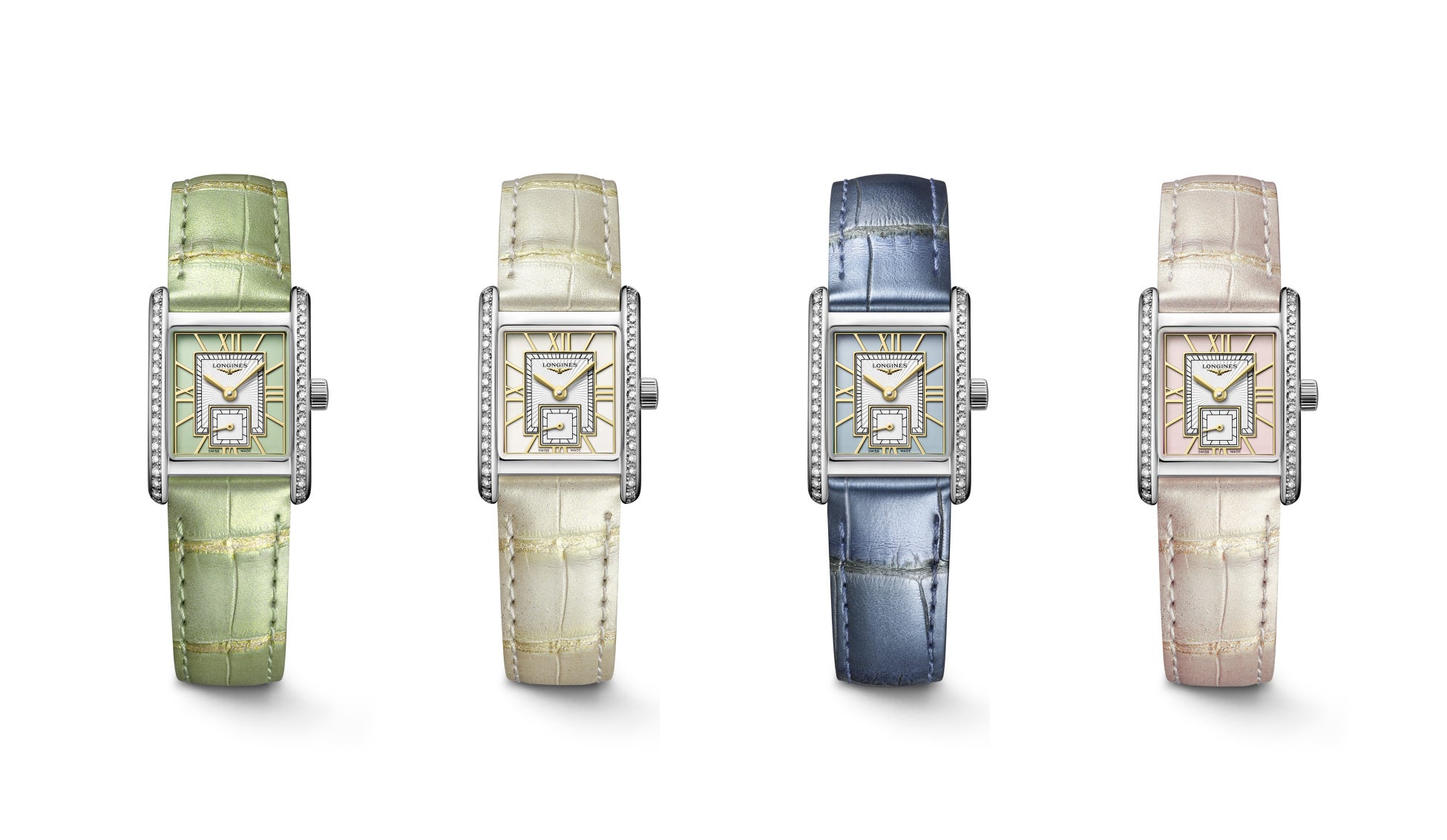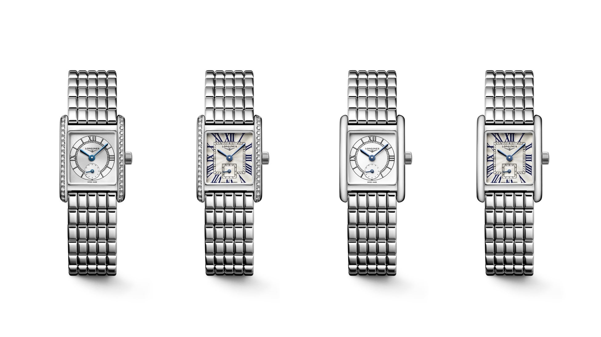 「ミニ ドルチェヴィータ」は、細部に至るまでクワイエット・ラグジュアリーと現代的なエレガンスを表現した、ジュエリーのようなレクタンギュラーウォッチ。ローマ数字やブルースティール針が美しいクラシックスタイルの7モデル(コスモダイアル/レクタンギュラーダイアル)、パステル調のスタイリッシュなカラーが印象的な4モデル(ミント・グリーン/アイボリー・ホワイト/セレーネ・ブルー/ブロッサム・ピンク)の計11モデルを展開。21.50mm×29mmのステンレススティール製ケースに、ダイアモンド(トップ ウェッセルトンIF-VVSダイアモンド/38粒・合計0.456カラット)をセッティングしたモデル、また198個のリンクがジュエリー感を高める新デザインのステンレススティール製ブレスレット、ダイアルにマッチしたカラーリングのレザーストラップをラインナップ。薄型で小ぶりなサイズ、滑らかでピュアなラインには、タイムレスな美しさが宿ります。フォーマルからカジュアルまでシーンを選ばず、日常に輝きを与えるタイムピースです。