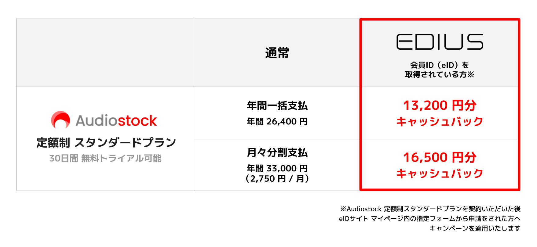 「EDIUS」の会員ID(eID)を取得している方がAudiostockの定額制スタンダードプランを契約すると、お得にご利用いただけるキャンペーンを2022年12月22日(木)より開始いたします。