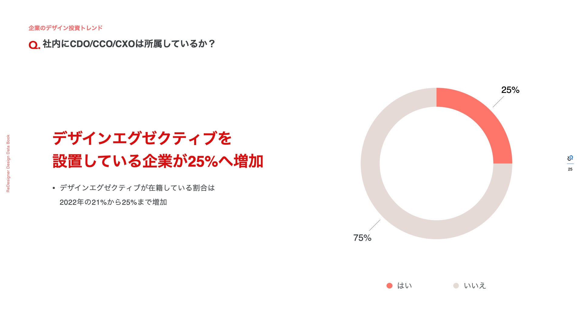 CDO(チーフ デザイン オフィサー)・CCO(チーフ クリエイティブ オフィサー)等、デザインエグゼクティブを置いている企業は25%に増加(前回調査比+4%)