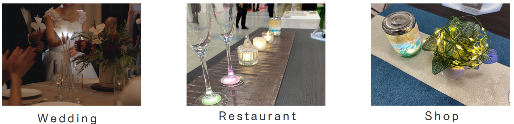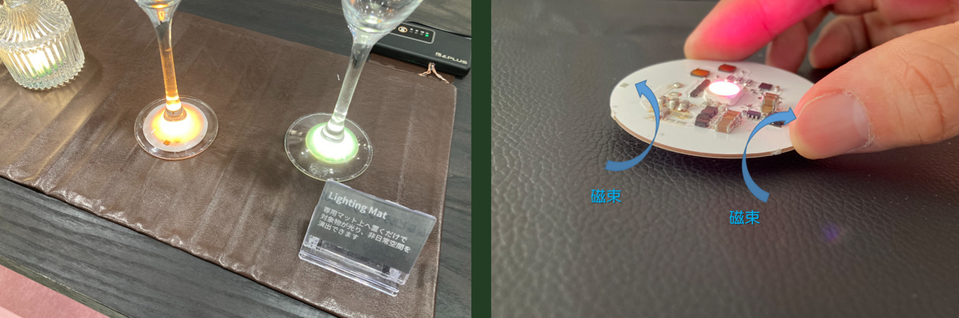 マットの上に敷くテーブルランナーの色や柄はお好きな市販品をご利用頂けますので、店舗のイメージ、テーマカラー、メニューに合わせたコーディネートが可能です。また、LED付き受電コイルのカラーや点灯方法を変更することでコンセプトに合わせた演出ができます。非接触給電なので、感電や火災の心配がありません。