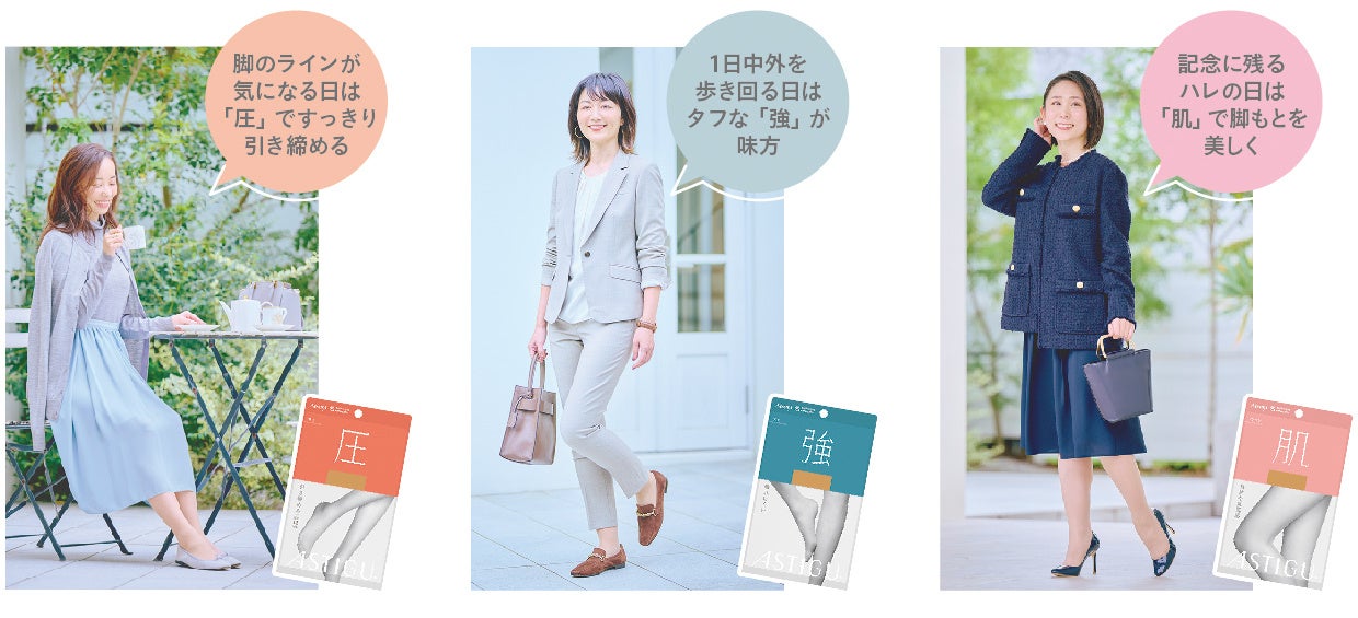 読者モデルの皆さんからは、普段お使いのストッキングとアスティーグの違いに「履き心地も見た目も全然違ってびっくり、なにより肌がキレイに見える」「締めつけ感がないのに、座ったり立ったりしてもズレ落ちてこない」「強度に配慮されているのもうれしくて。こんなに進化したストッキングがあったなんて」との声が寄せられました。豊富な商品展開も高評価でした。