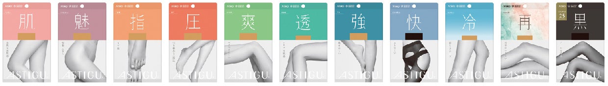 アスティーグは、プレーンストッキングを求める全ての方のニーズにお応えできる、11種類のラインアップを展開しています。商品特長をわかりやすく示した漢字一文字のパッケージが目印。サイズ・カラーも豊富に取り揃えています。