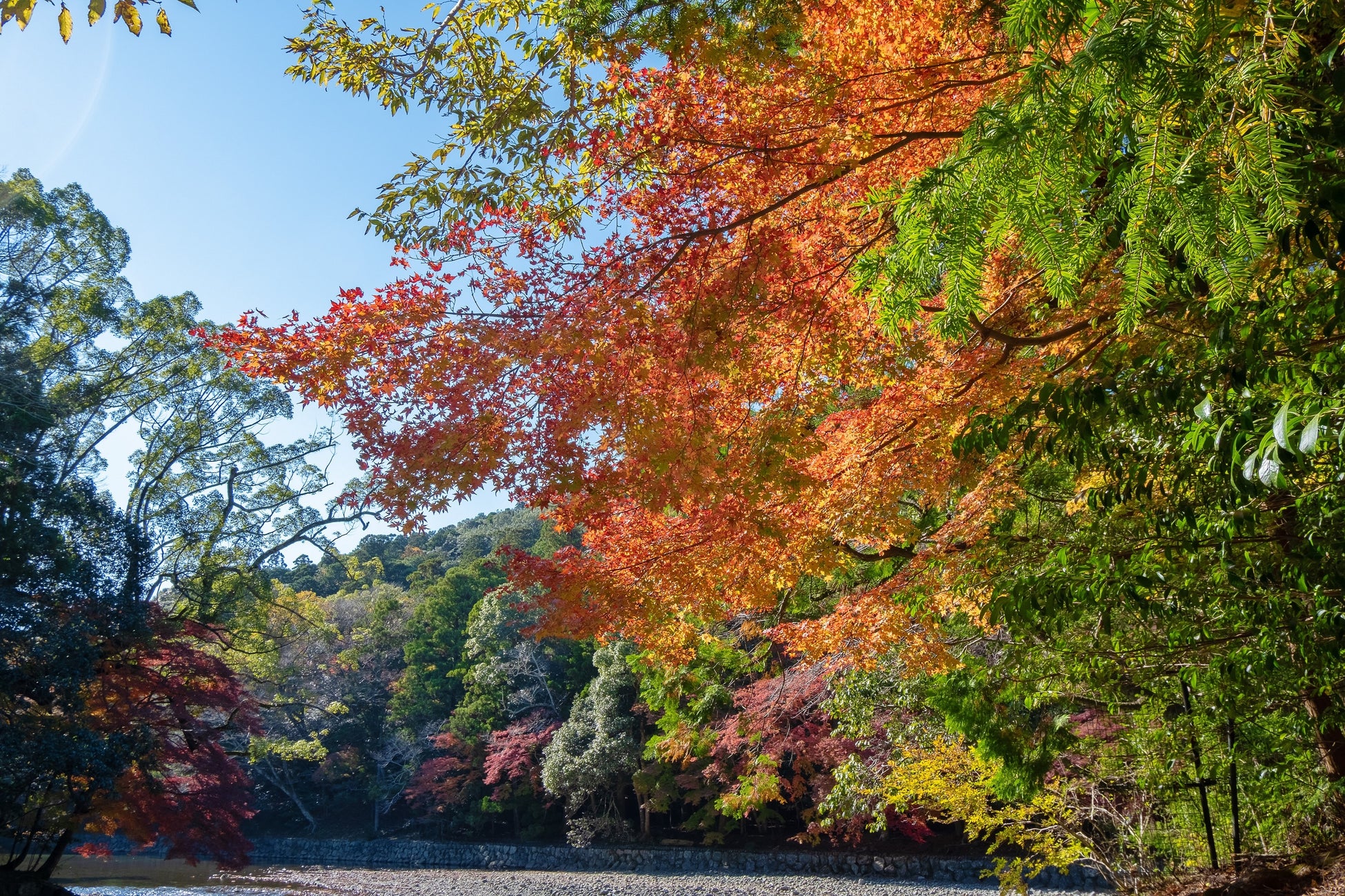 伊勢神宮内宮は神路山を水源とする神路川と島路山を源とする島路川の2つの流れが合流した、五十鈴川の上に位置しています。秋も深まると内宮では鮮やかな紅葉が広がり、御手洗場では色づき始めた木々たちが水面に映ります。