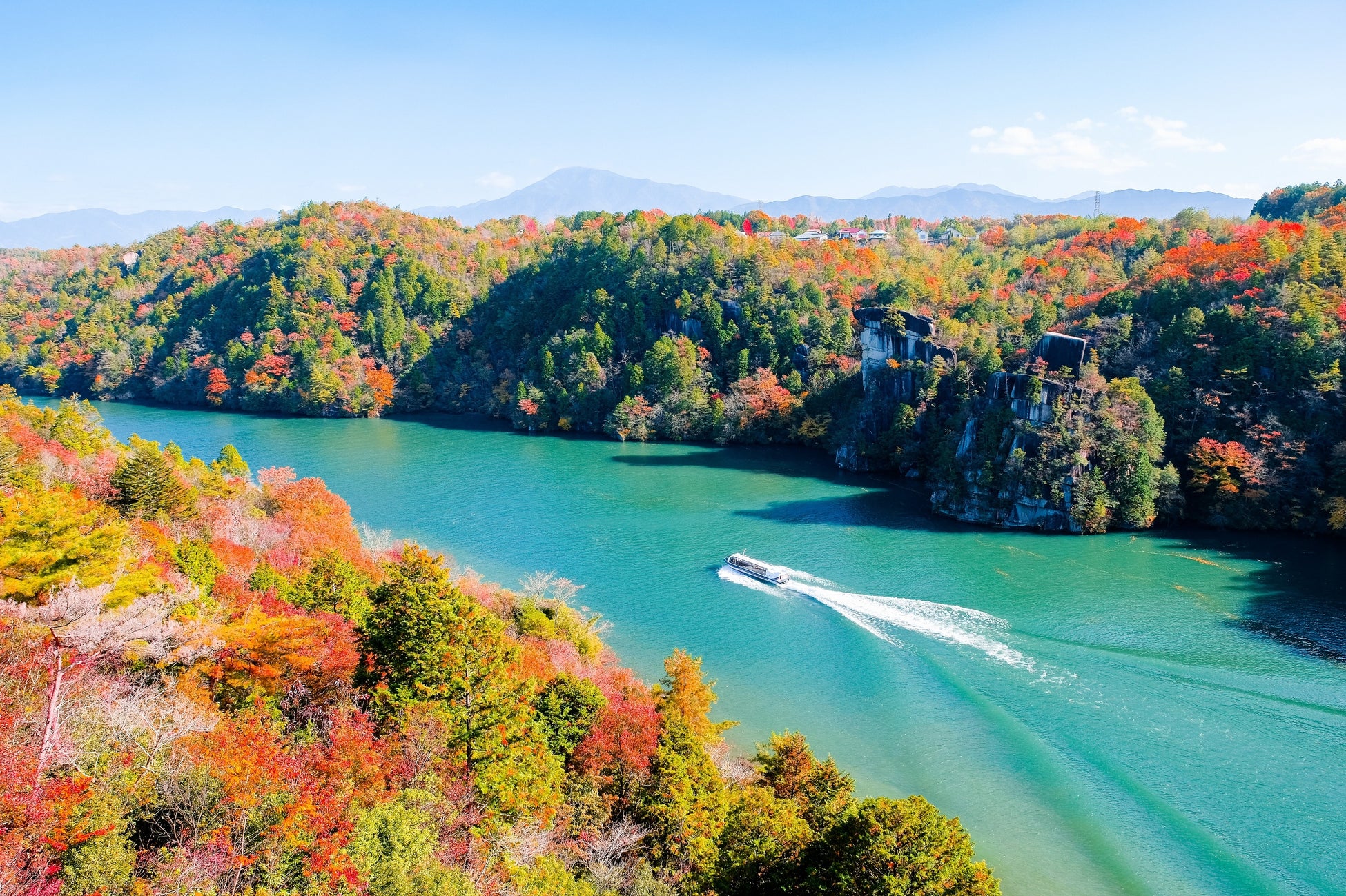大自然が創る芸術の面白さに満ちた恵那峡。四季折々の渓谷美を満喫できる大井ダム周辺の景勝地で、秋にはモミジやカエデなどが湖面を華やかに彩ります。秋の訪れを感じながら、遊歩道の散策や、遊覧船に乗って両岸の断崖絶壁の紅葉を眺めるなど、他ではできない楽しみ方もおすすめです。