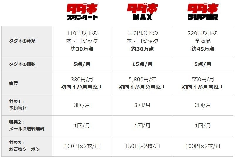 2019年のサービス開始から、多くのお客様にタダ本サービスをご利用いただいておりますが、もっと気軽に利用したい、対象商品を増やしてほしいというお声をいただいておりました。月間330円から気軽にタダ本を利用できる「タダ本スタンダード」、ゲームやDVD・CD、販売価格220円の商品も対象となる「タダ本SUPER」など、利用シーンにあわせて選べる3つのプランにリニューアルいたしました。