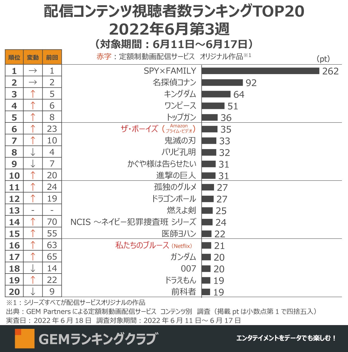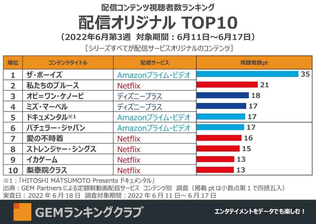 エンタテイメント業界に向けたデータ×デジタルマーケティングサービスを提供するGEM Partners株式会社(ジェムパートナーズ、所在地:東京都港区、代表取締役:梅津文)は6月23日(木)、複数の定額制動画配信サービスを横断して集計した2022年6月第3週の「配信サービス視聴者数ランキングTOP20(調査対象期間:6月11日~6月17日、調査対象:日本在住15~69歳男女)」を発表します。
