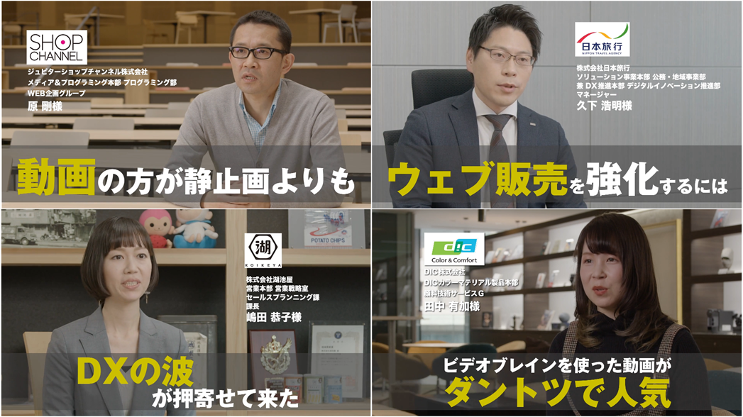今回は、ジュピターショップチャンネル様、日本旅行様、湖池屋様そしてDIC様の4社にご協力いただき、各社における動画を軸としたコミュニケーションDXのサクセスケースをお話し頂きました。「顧客インタビュー」シリーズは、2022年2月28日(月)より日本最大のタクシー・サイネージメディアTOKYO PRIMEで配信されます。