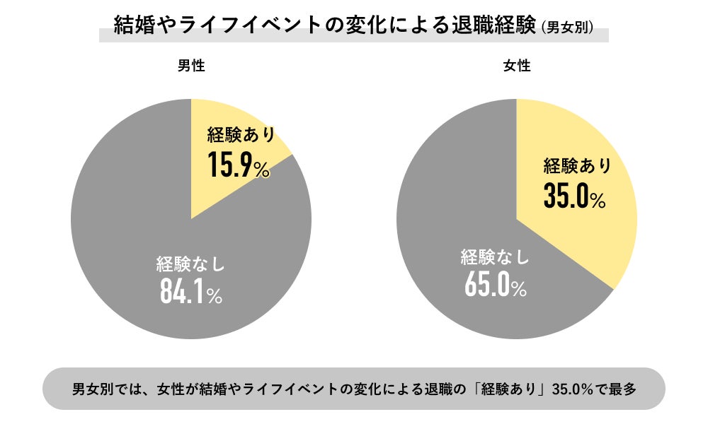 | 【TOPICS】 ・全体の6割が退職を経験 理由はキャリアアップが最多 ・5割弱が退職理由を「本音で伝える」と回答 「嘘で伝える」は4割強 ・ライフイベントが影響した退職経験者は全体の2割 女性は2割 ・全体の9割はライフイベントでの退職に「後悔していない」と回答 |