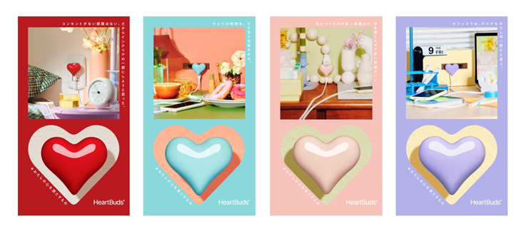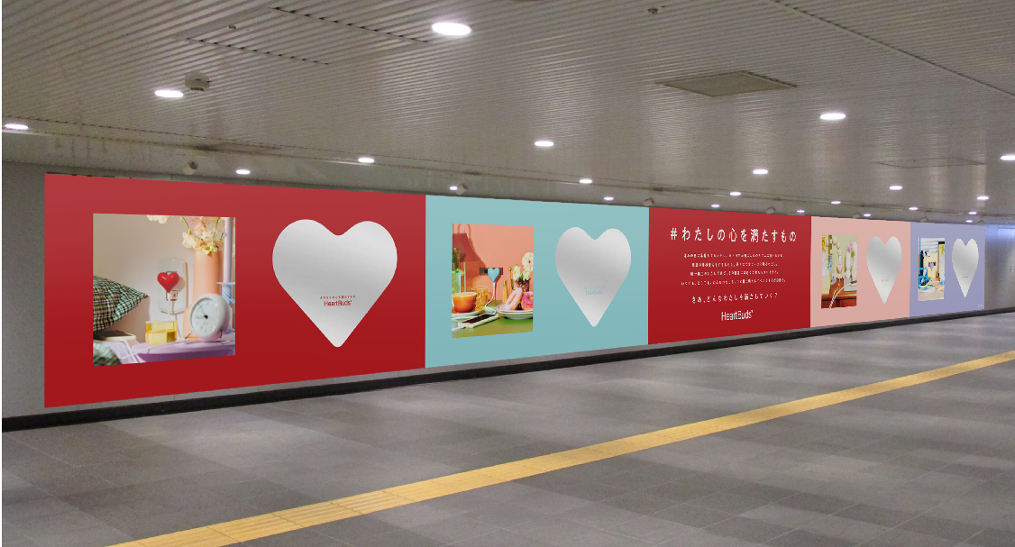 「HeartBuds(Charger)」は自宅、カフェ、職場などさまざまな生活シーンでご使用いただけます。充電器としての機能だけではなく、可愛いデザインがインテリアのようにあなたの心を満たしてくれます。そんな商品の魅力を伝えるため、渋谷エリアに全長22mのOOH広告を掲出。各色のキービジュアルの横にはハート型の鏡があり、鏡に映るあなたの日常に合う商品であることを伝えているとともに、鏡越しに可愛い写真が撮れるようなデザインにもなっています。