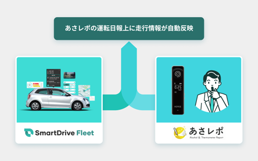 今回、両社サービスのシステム連携を行うことで、「あさレポ」の運転日報オプションで作成される運転日報に、「SmartDrive Fleet」の走行情報が自動反映されるようになります。従来のアルコールチェック記録と健康状態記録に加え、走行履歴も運転日報に自動記載されるようになり、サービス導入企業が簡単便利に法令遵守することを支援いたします。