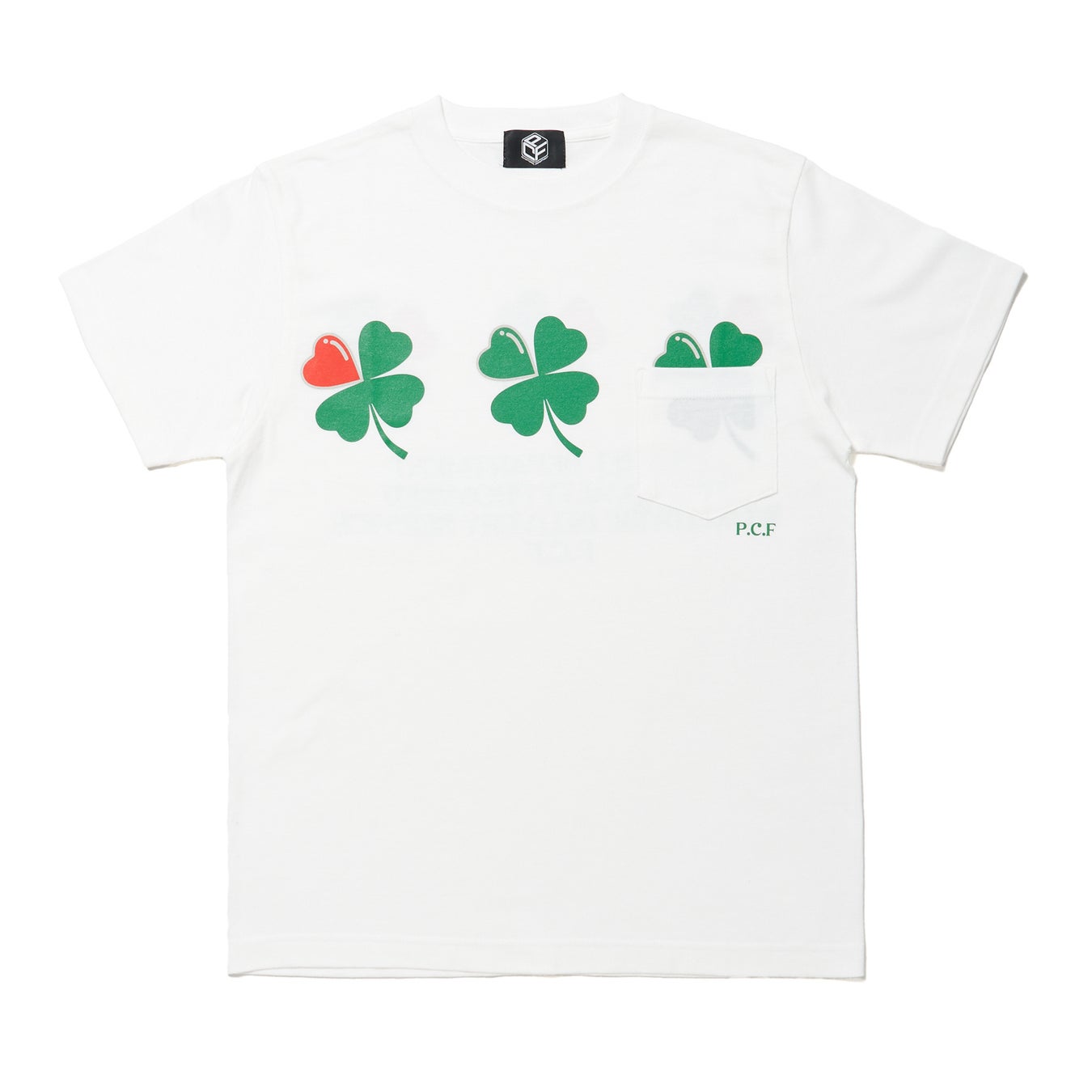 四つ葉のクローバーにハートを掛け合わせたアイコニックなグラフィックを用いたポケット付Tシャツ