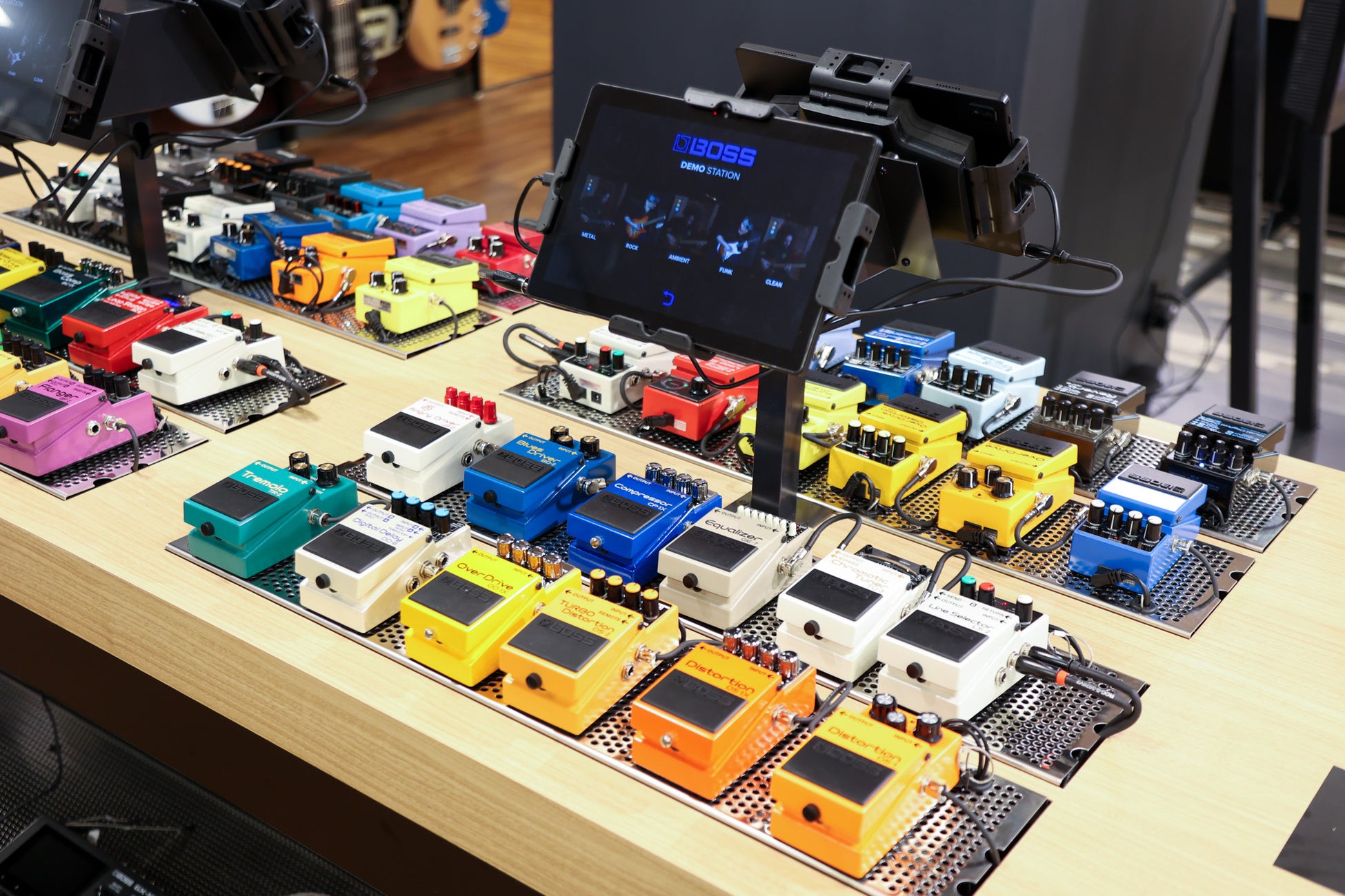 店内入口付近にはBOSSのコンパクトエフェクターを数多く展示。備え付けのタブレットとエフェクターを操作するだけで、ギターを弾かずにエフェクターをお試しいただけます。島村楽器でこの体験ができるのは『Roland × Shimamura Kawasaki』だけです。