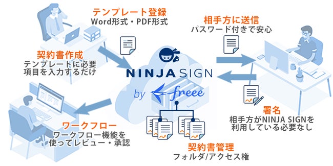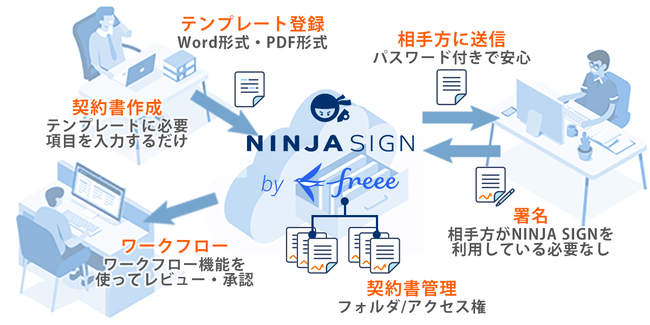 契約書をはじめとした様々な文書の【文書作成依頼】【作成】【レビュー】【締結】【保管】といった一連の業務をオンライン上で行えるワンストップ電子契約サービス「NINJA SIGN by freee」。不要な操作を一切無くし、“ニンジャ”のようにスピーディーな動作を実現、契約をはじめとした文書業務を影から支えます。また、必要機能に合わせた定額プランを5種用意し、低コストで導入・利用が可能です。