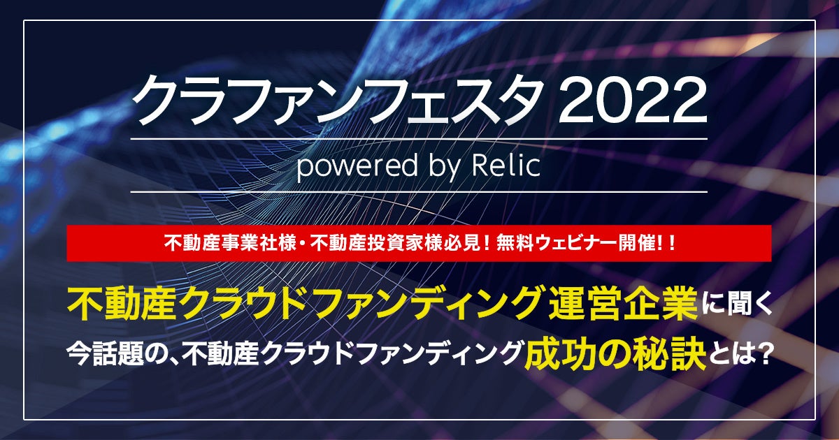 日本企業の新規事業開発やイノベーション創出を支援する事業共創カンパニーである株式会社Relic(本社:東京都渋谷区、代表取締役CEO 北嶋 貴朗、以下「Relic」)は、不動産クラウドファンディングサイトを運営する不動産事業者様及び行政書士の石井くるみ先生との無料共催ウェビナー「クラファンフェスタ powered by Relic 2022」を実施いたします。2022年9月2日(金)から順次開催され、10月28日(金)までの期間において、様々な事業者様や業界の有識者・プロフェッショナルをお招きして、不動産特定共同事業法や不動産投資型クラウドファンディングに関する最先端の事例やコンテンツをお届けします。