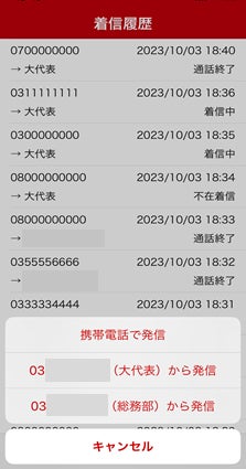 ③着信履歴画面から折り返す際に、携帯電話番号で発信するか、会社の固定電話番号で発信するか、選択できるようになりました。(iOS、Androidともに実装)
