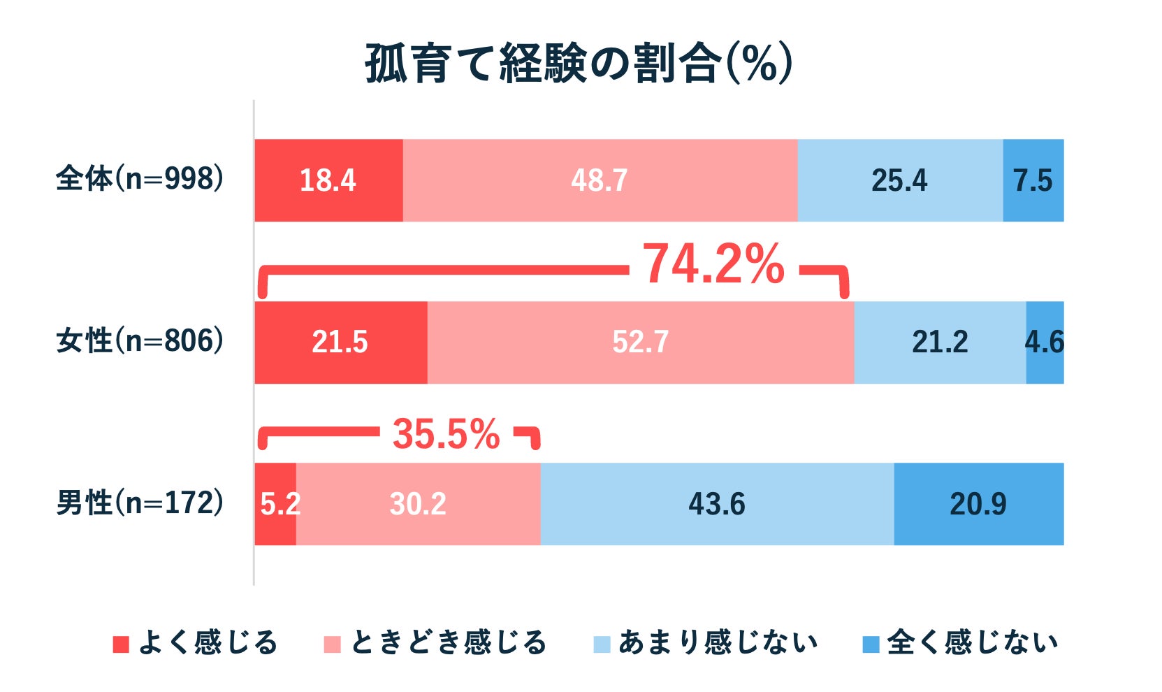 孤育て経験の割合:子育て中に孤立や孤独を感じたことがある女性は74.2%。男性(35.5%)の2.1倍。第一子が0歳の時に最も孤独を実感(57.9%)。
