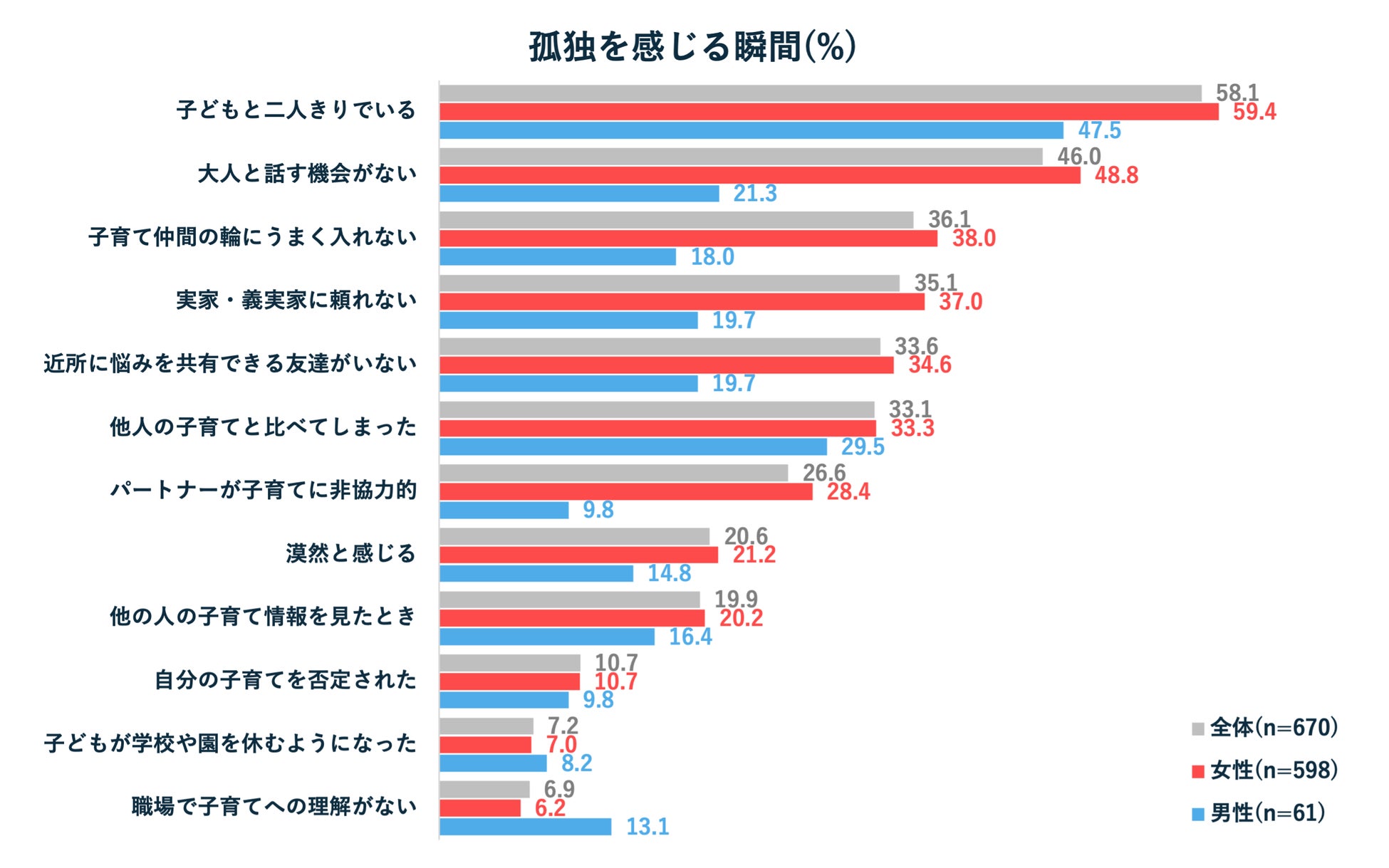 孤独を感じる瞬間は「子どもと二人きりでいる」ときが最多、 男女差が特に大きいのは「大人と話す機会がない」で女性は男性の2.3倍。