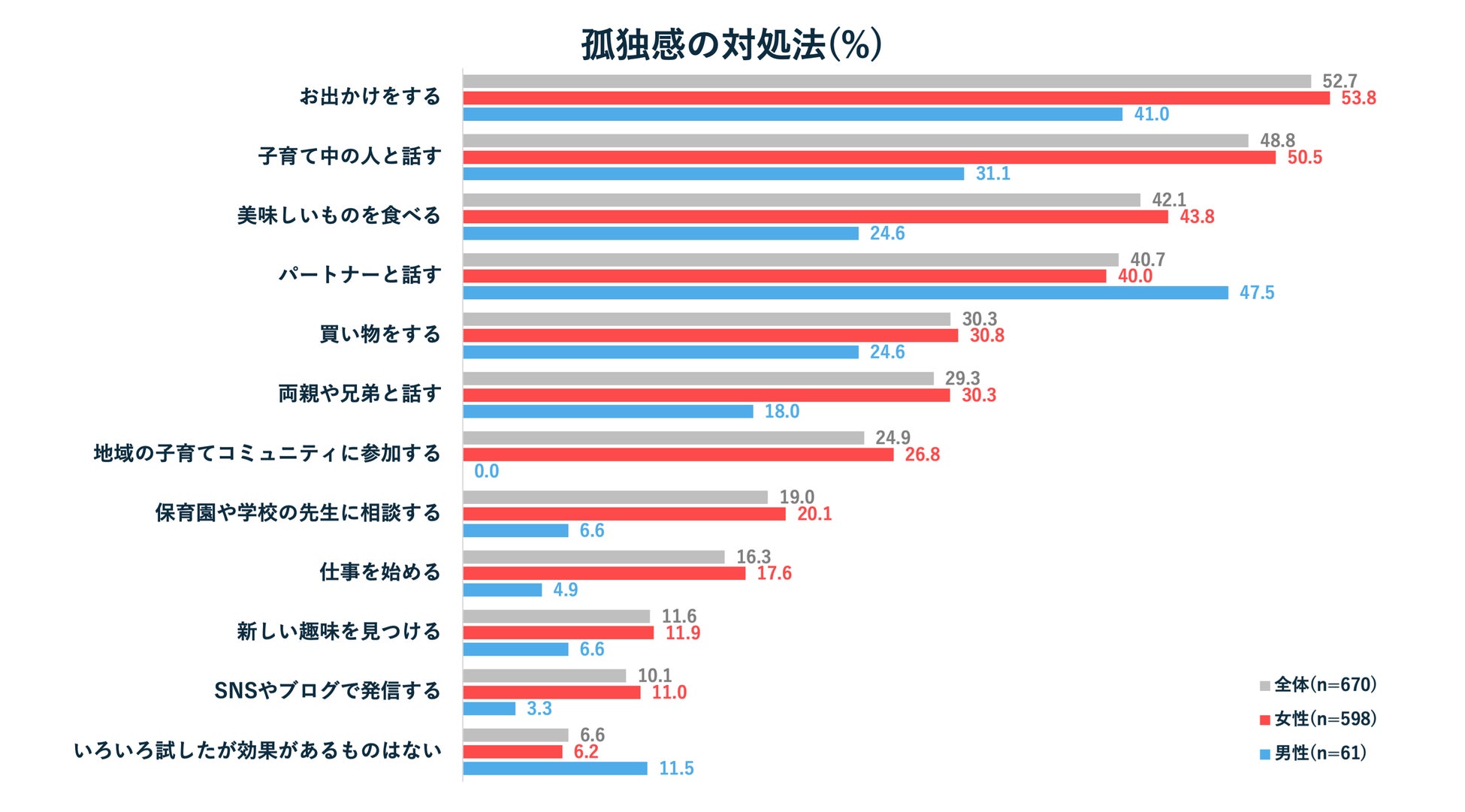 孤独を感じた際に効果のあった対処法を尋ねたところ、半数以上の女性は「おでかけをする(53.9%)」「子育て中の人と話す(50.5%)」と回答しました。一方、男性は「パートナーと話す(47.5%)」が最も多い結果となり、男女のコミュニケーション相手に違いがあることがわかりました。