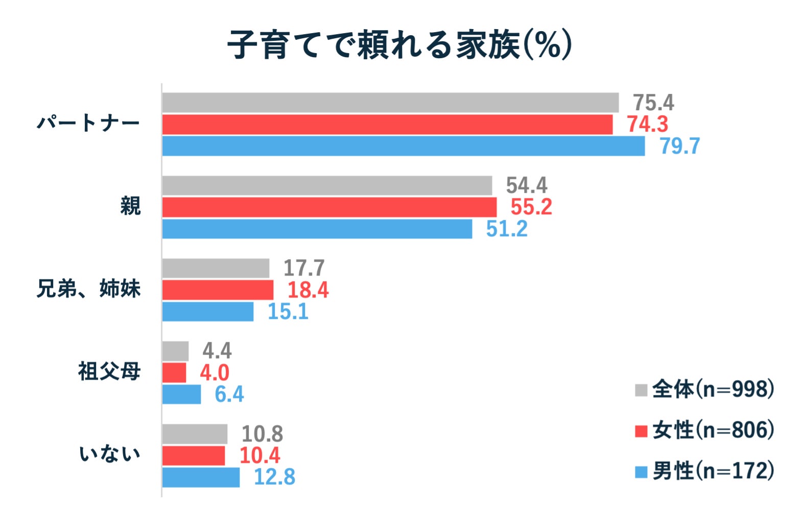最後に、子育てに関して頼れる存在について尋ねました。子育てで頼れる家族は「パートナー」が最多で、女性は74.3%、男性は79.7%と特に高いことがわかりました。また、男女共に半数以上(女性:55.2%、男性:51.2%)の人が子育て中に親を頼るという一方で、10人に1人は頼れる家族がいないことが明らかになりました。