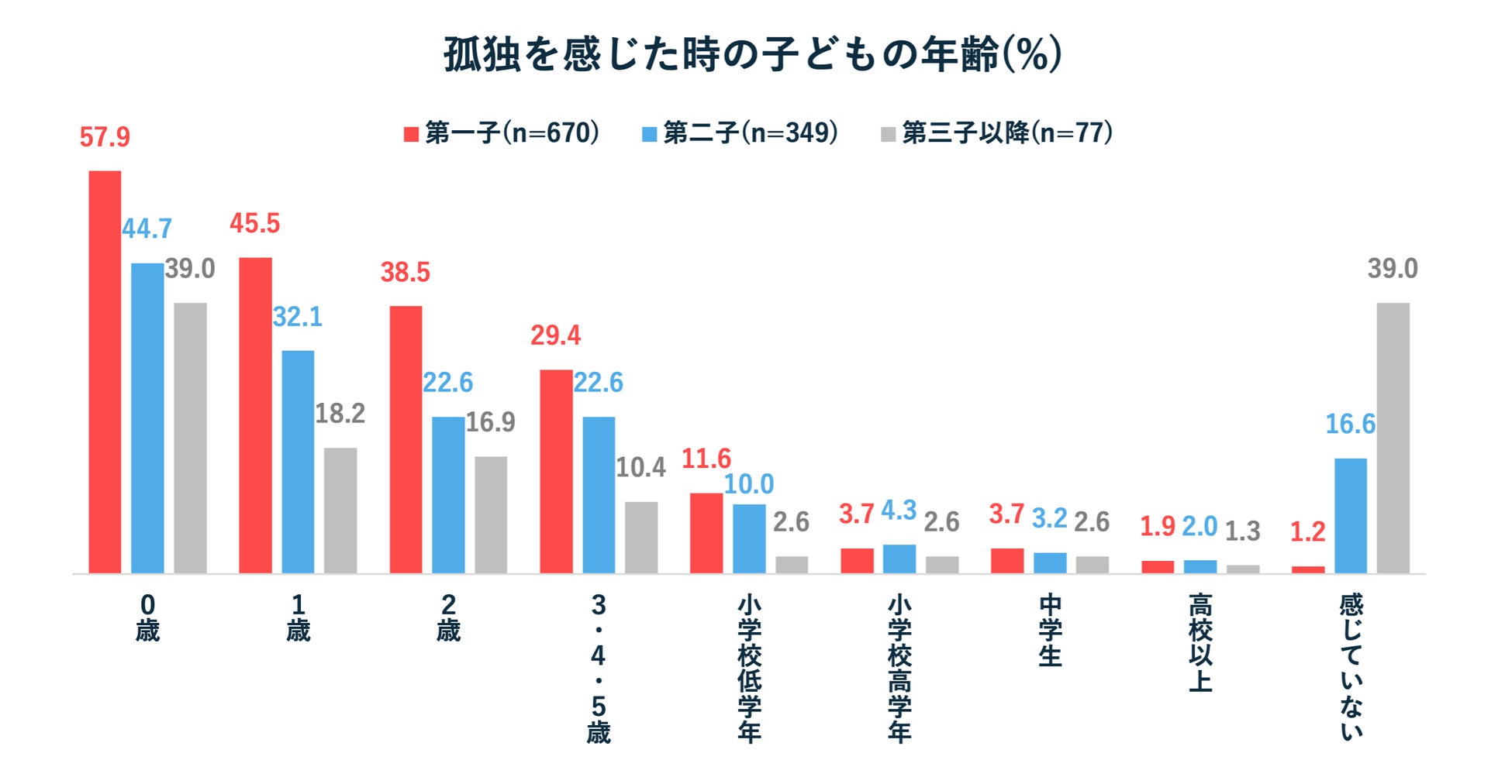孤独を感じたことがある人に、子どもの年齢がいくつの頃に孤独を感じたのかを聞きました。孤独を感じている割合が高いのは新生児〜未就学児の頃で、特に第一子が0歳の時は57.9%の人が孤独を感じていました。子どもが大きくなるにつれて孤独を感じる機会は減少しますが、子どもの人数に関わらず、子どもが0歳の頃は孤独を感じやすい傾向があります。