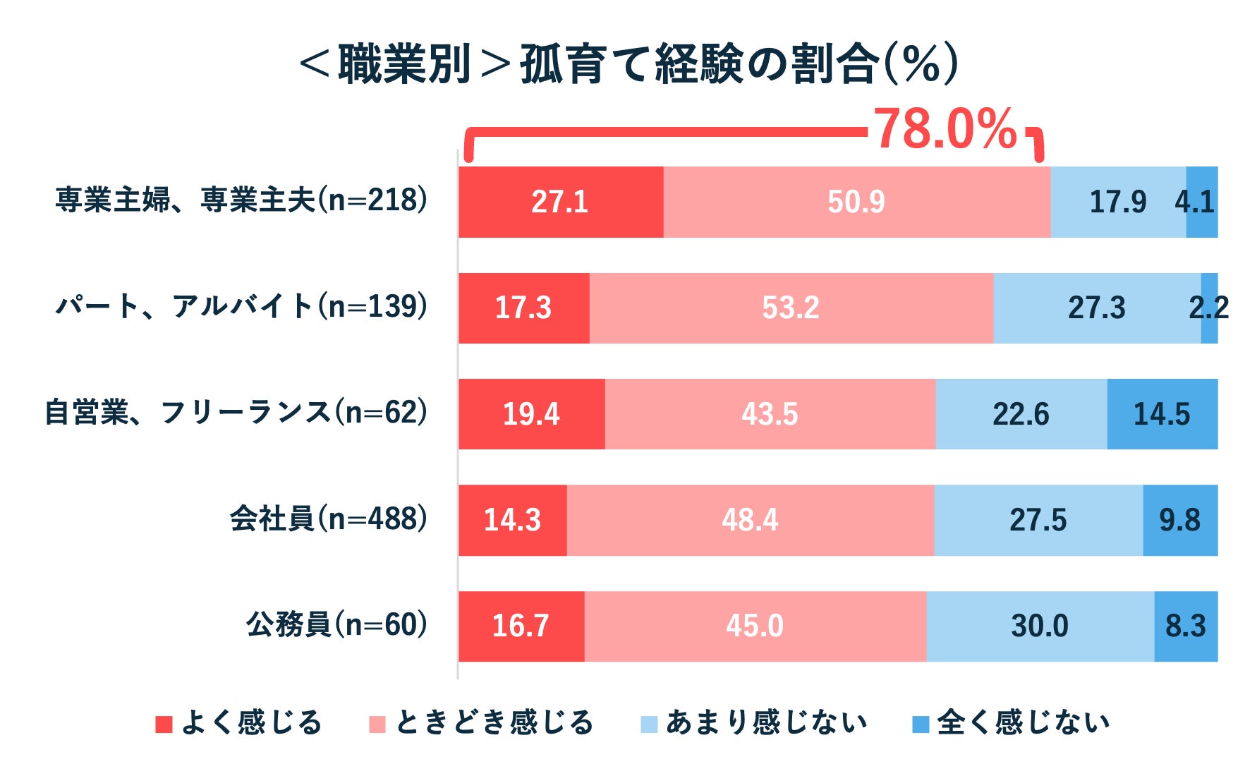 職業別で見ると、子育てで孤独を感じたことがあると回答する人は専業主婦(主夫)で特に高く、全体平均67.1%と比べて10.85ptも高い78.0%でした(よく感じる:27.1%、ときどき感じる:50.9%の合計)。家庭以外のつながりや社会との接点が少ない場合は、孤独や孤立を感じやすいと言えます。