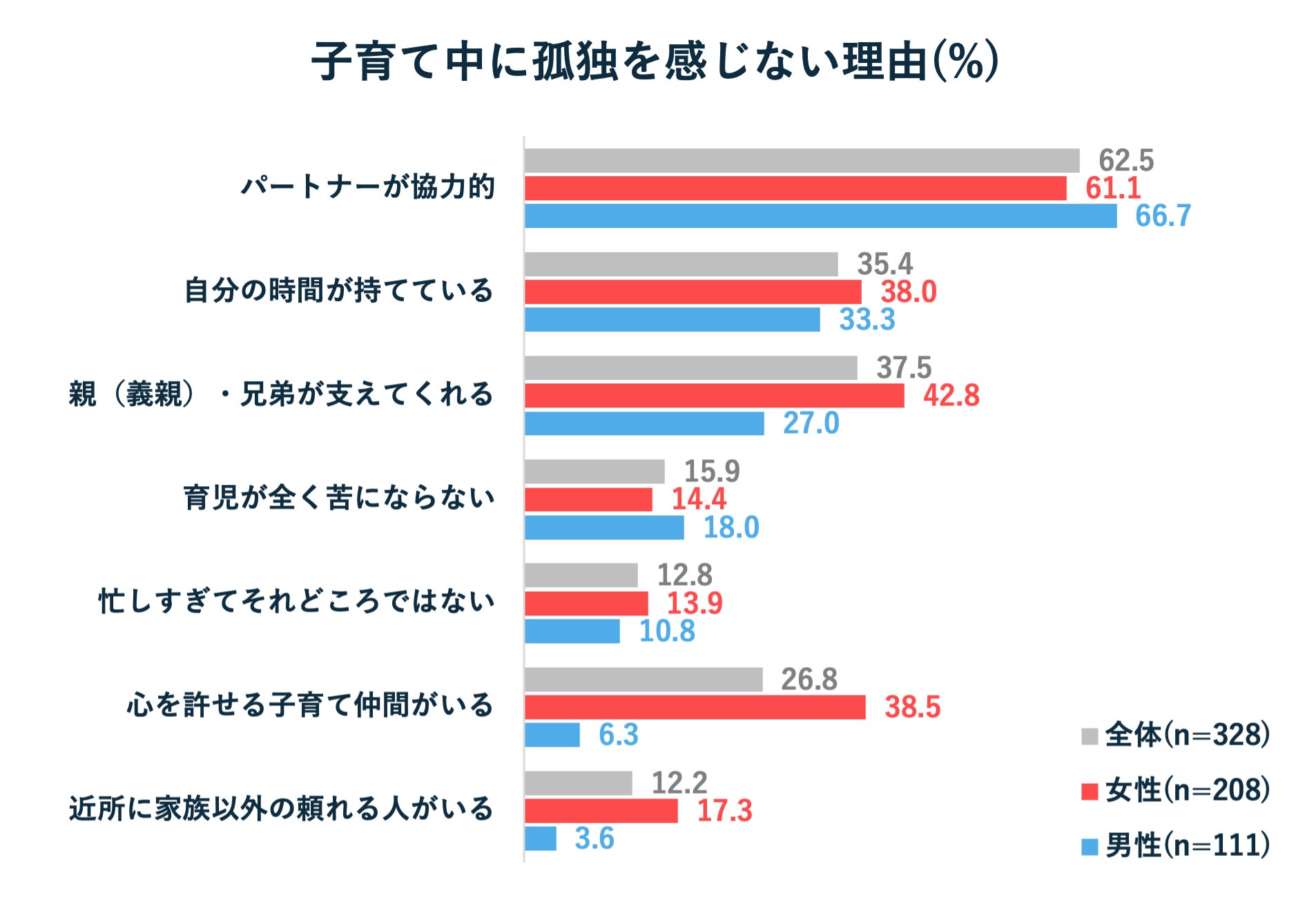 孤独を感じない理由:男女共に「パートナーが協力的」が6割以上で多数を占める。女性の「心を許せる子育て仲間がいる」割合は男性の6.1倍(女性:38.5%、男性:6.3%)。
