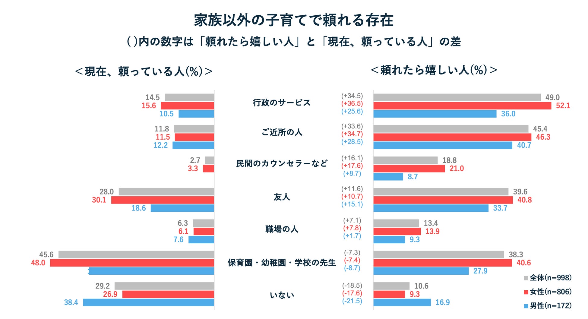 家族以外で子育てに関して頼れる人を尋ねたところ、最も多いのが「保育園・幼稚園・学校の先生(45.6%)」で、女性は48.0%、男性は36.3%でした。一方、子育てで頼れたら嬉しい人では、女性1位は「行政のサービス(ファミリーサポートなど)」と最多(52.1%)で、男性1位は「ご近所の人(40.7%)」となりました。それぞれ、”現在頼れている”割合との差が最も大きい結果となり、行政やご近所の人など、地域内での助けを頼りたいが頼れていない実態が浮かび上がってきました。