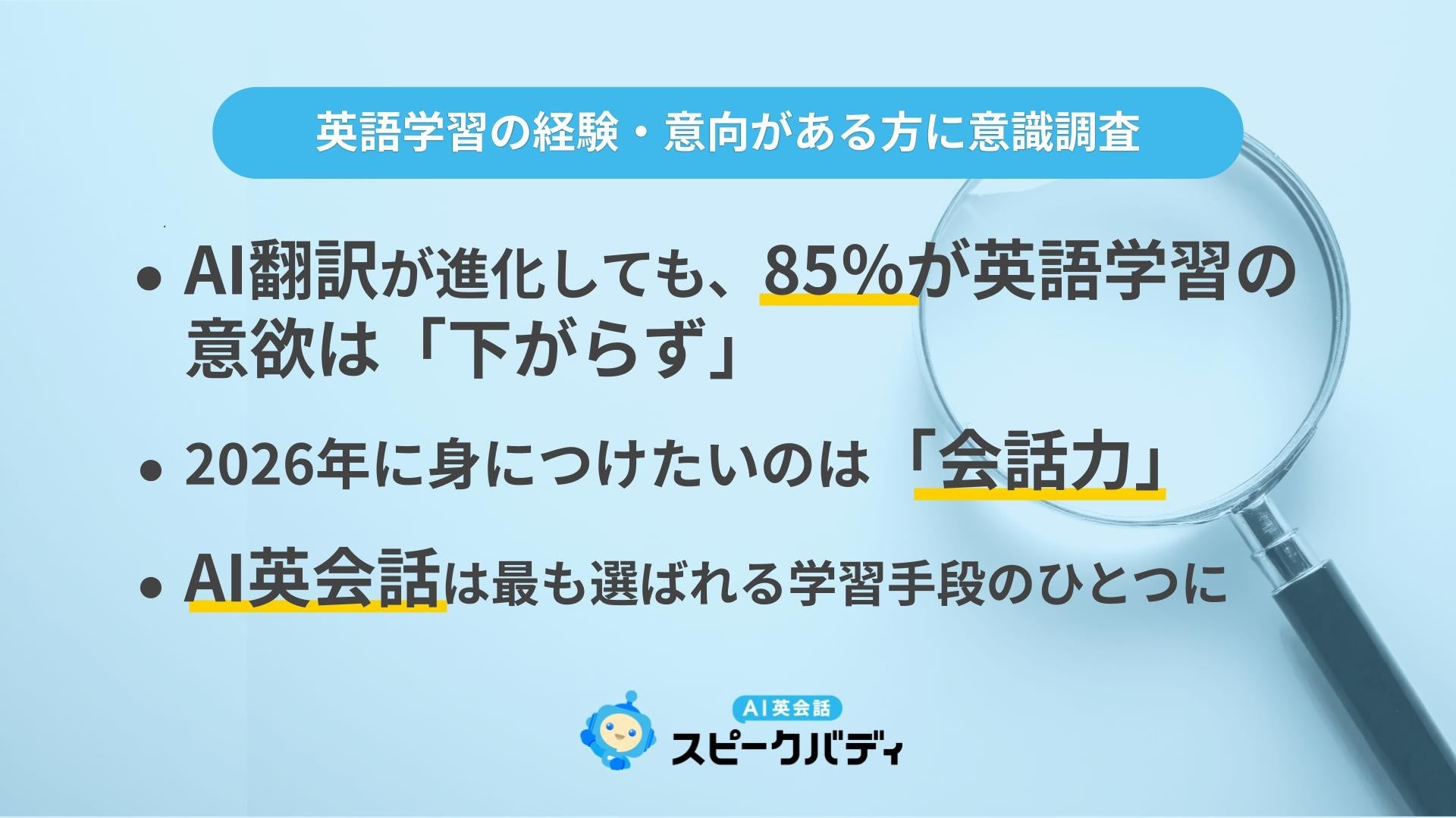 生成AIやAI翻訳が急速に進化し、文章の“読む・書く”作業の大部分、さらには“聞く・話す”の一部までをAIが担えるようになりつつある2025年。こうした技術環境の変化が進む中でも、英語を「自分の言葉で話したい」という意欲は揺らいでいないことが本調査で明らかになりました。