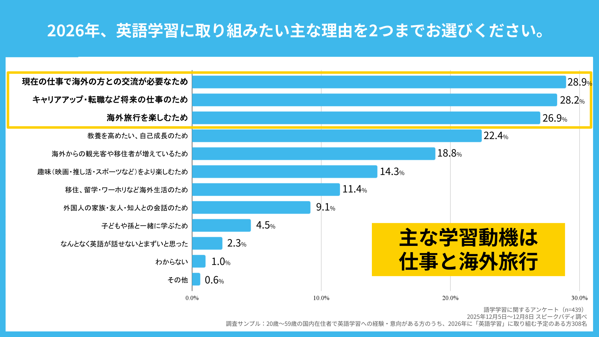 まもなく新しい年を迎えるにあたり、来年の目標を考え始める人も多い時期ですが、こうした結果からは、2026年も英語学習が引き続き主要な自己投資テーマとして選ばれることがうかがえます。