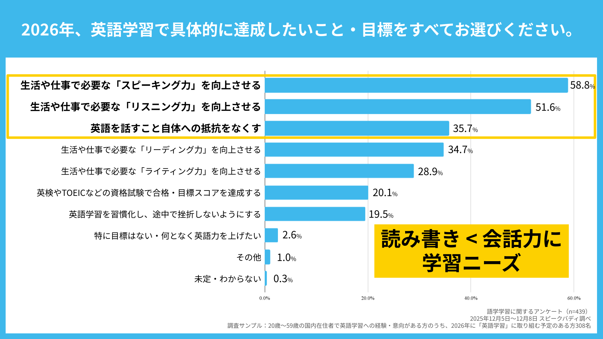 さらに、2026年に身につけたいスキルとしては「スピーキング力」が最多(58.8%)となり、AI時代において“話す力”の重要性があらためて注目される状況が浮かび上がっています。