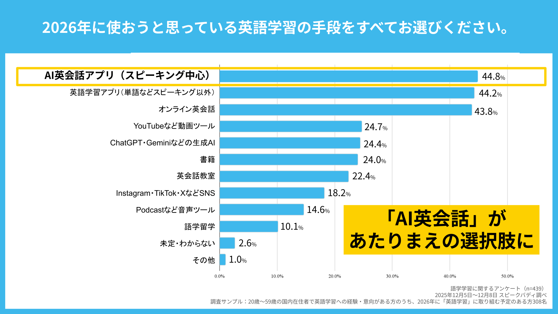 2026年の学習手段は拮抗するも、AI英会話が最多