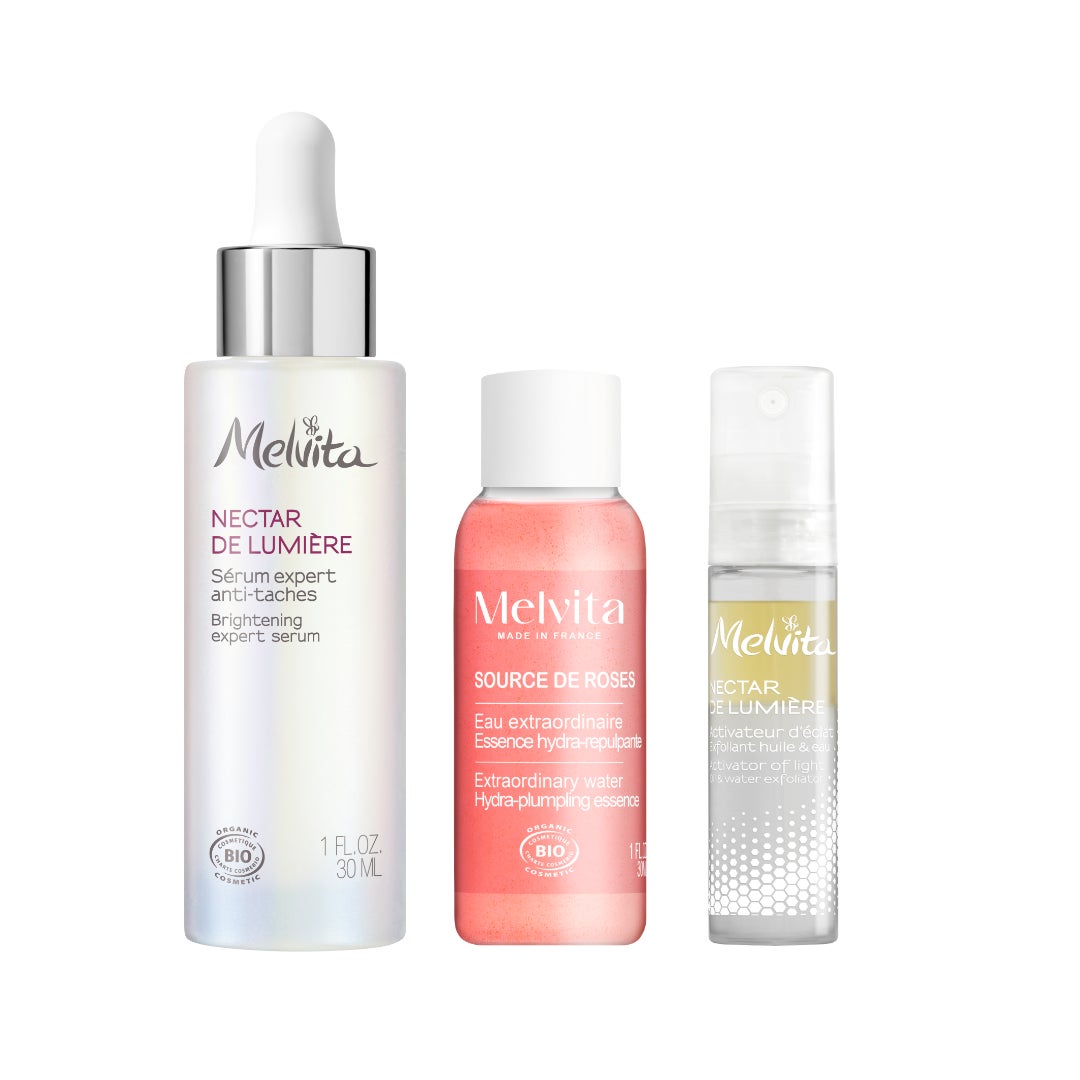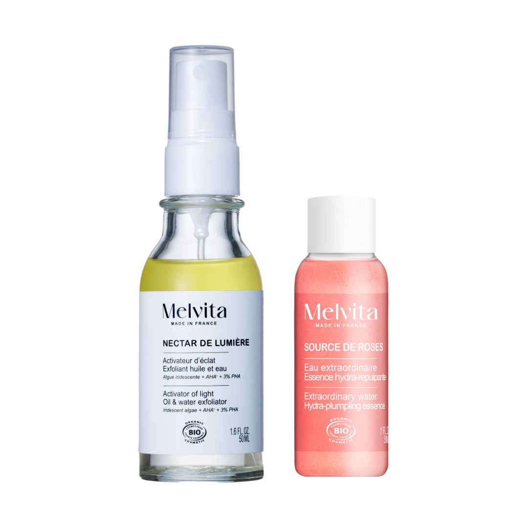 毛穴・角質・保湿・ブライトケアができる1本4役の導入美容液は、各美容媒体でベストコスメを受賞。ブランド初のオイルフラクションテクノロジーを採用した新感覚の化粧水のミニサイズをセット。はじめてメルヴィータをお使いいただく方にピッタリ。