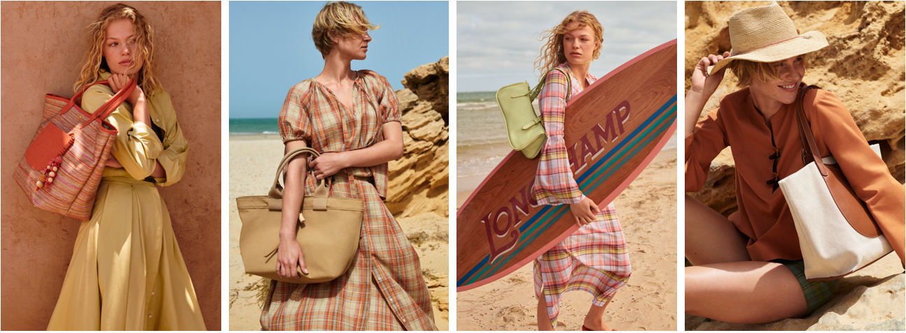 今季の“現代のパリジェンヌ”は、パリとビーチを行き来しつつ、肌に感じる太陽の温もりと波が奏でるリズムを夢見ています。メゾンの新コレクション「ローング」や夏新作を相棒に、カラフルなマドラスチェックやグラフィカルなストライプが躍るシルエットのプレタポルテ、シューズやサングラスに身を包みます。彼女たちの心に湧く高揚感は、プレタポルテのシーズン限定ラベルやシルクスカーフにも描かれているように、美しい夕日とシュリンプやミントに色づいて寄せ打つ波を背景に、潮風と砂粒をはらんだたてがみをなびかせて、騎手を乗せずに自由に海岸を駆け巡る“ロンシャン・ホース”さながらです。サーフカルチャーのエナジーに感化され、夏がもたらすリラクシーなひとときを心ゆくまで満喫します。