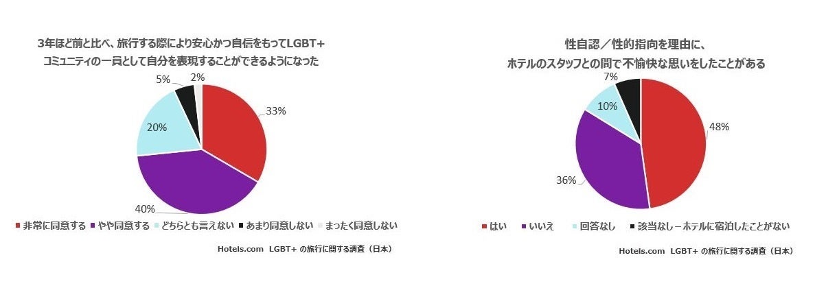 近年、日本でも多様性やインクルージョンの重要性が徐々に浸透してきています。Hotels.comが実施した国内のLGBT+の方々を対象とした旅行に関する調査※によると、回答者の73%が3年前と比べて、旅行をする際により安心かつ自信をもってコミュニティの一員としての自分を表現することが出来るようになったと答えました。また同じく43%が、他国と比較して日本はLGBT+グループを歓迎していると認識していることも分かりました。しかしその一方で48%が「旅行先でホテルのスタッフとの間で不愉快な思いをしたことある」と回答しており、日本での旅行をよりインクルーシブなものにするためには、できることがまだまだあるようです。