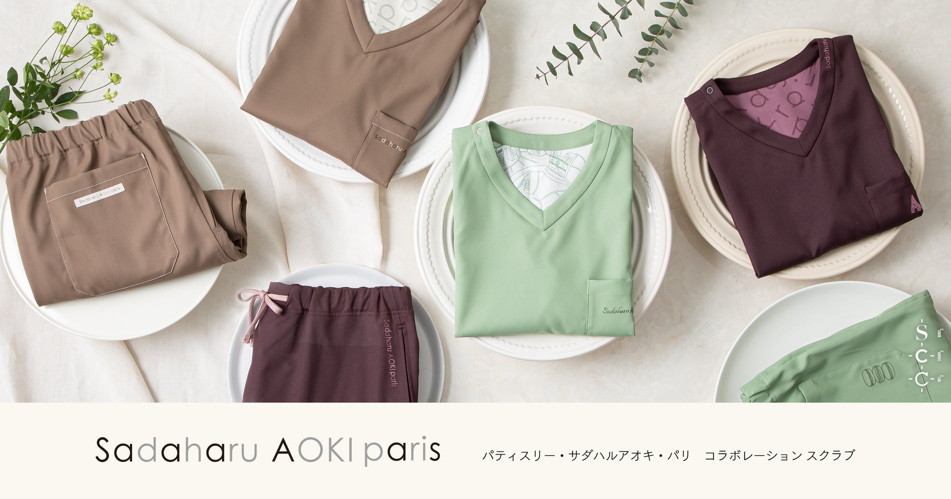 ショーケースの中から自分好みのスイーツを選ぶような楽しみをユニフォームにも感じられたら、という想いから、今回コラボレーションに至ったフランス・パリを代表するパティスリー『パティスリー・サダハル・アオキ・パリ』。洗練されたロゴとパティスリーの象徴でもあるマカロンや、本店を構えるパリから着想を得たスクラブコレクションは、選ぶ人はもちろんのこと見る人にも楽しさを届けます。ご自身へのご褒美や、大切な人への贈り物としてもぴったりです。
