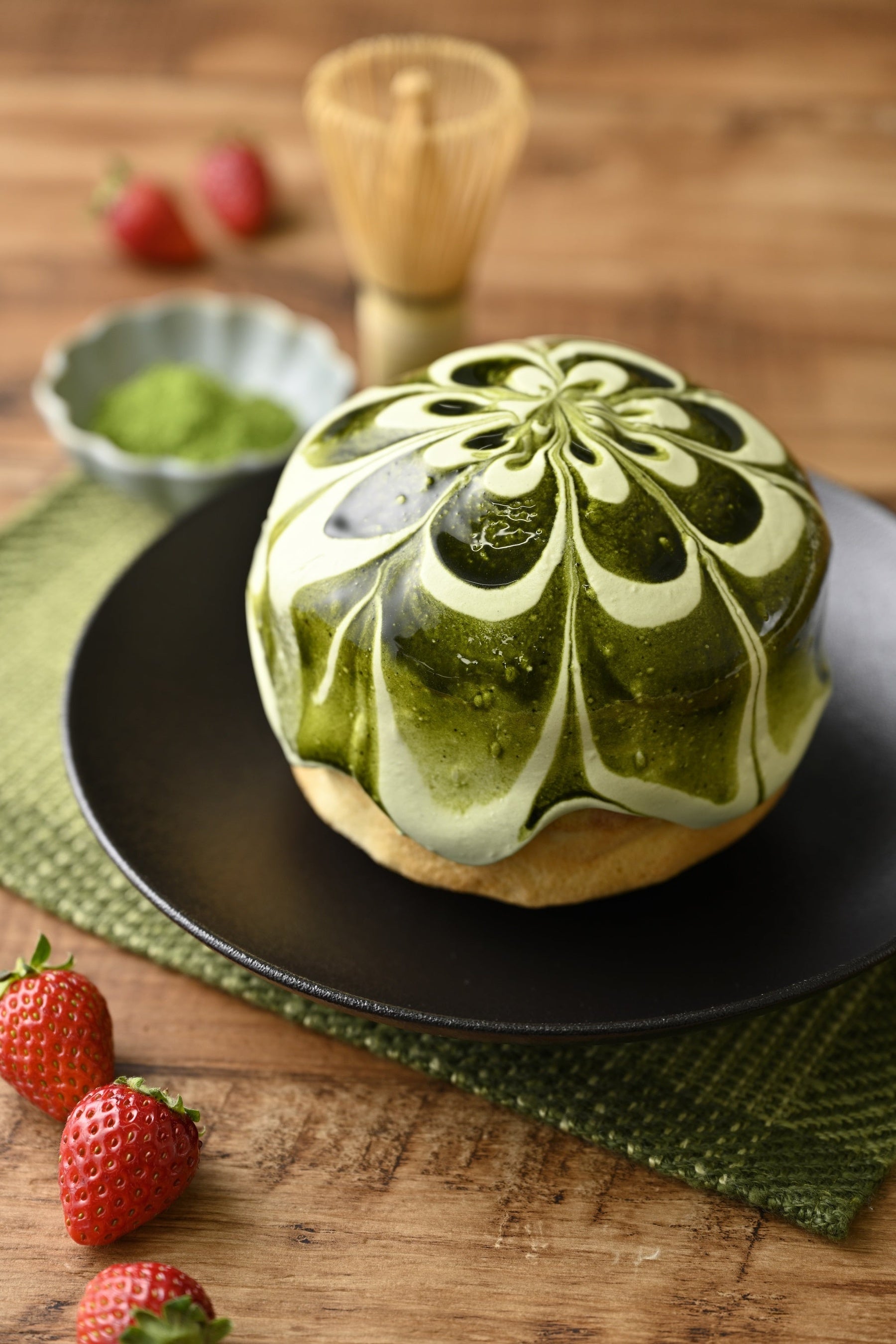 北海道産いちごのコンフィチュールと北海道あずきをサンドし、宇治抹茶クリームを合わせました。