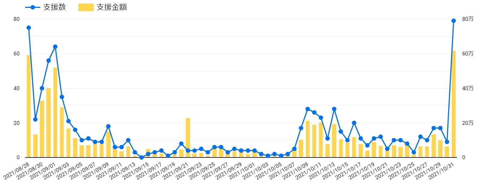 支援募集期間を通じた支援数(折れ線)、及び支援金額(棒線)