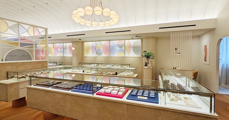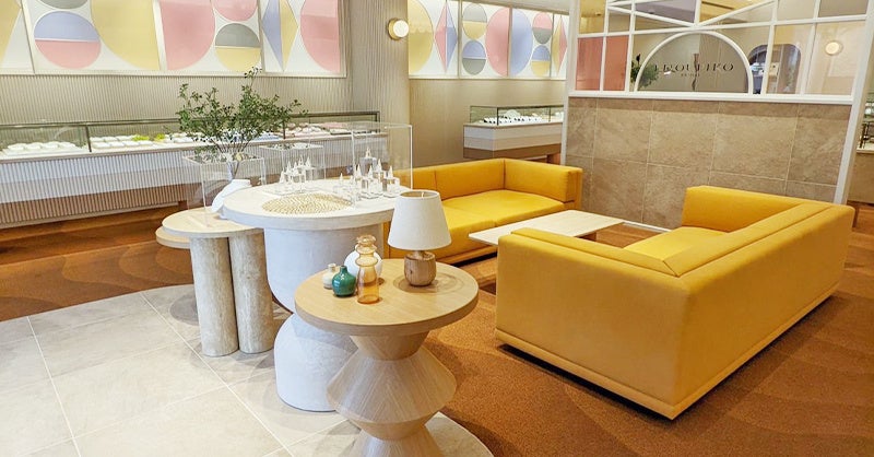 店内はステンドグラスのようなカラフルな装飾が特徴的で、モダンな雰囲気に仕上がっています。曲線のデザインが多く使用された温かみのある店内で、リラックスしながら指輪をご覧ください。