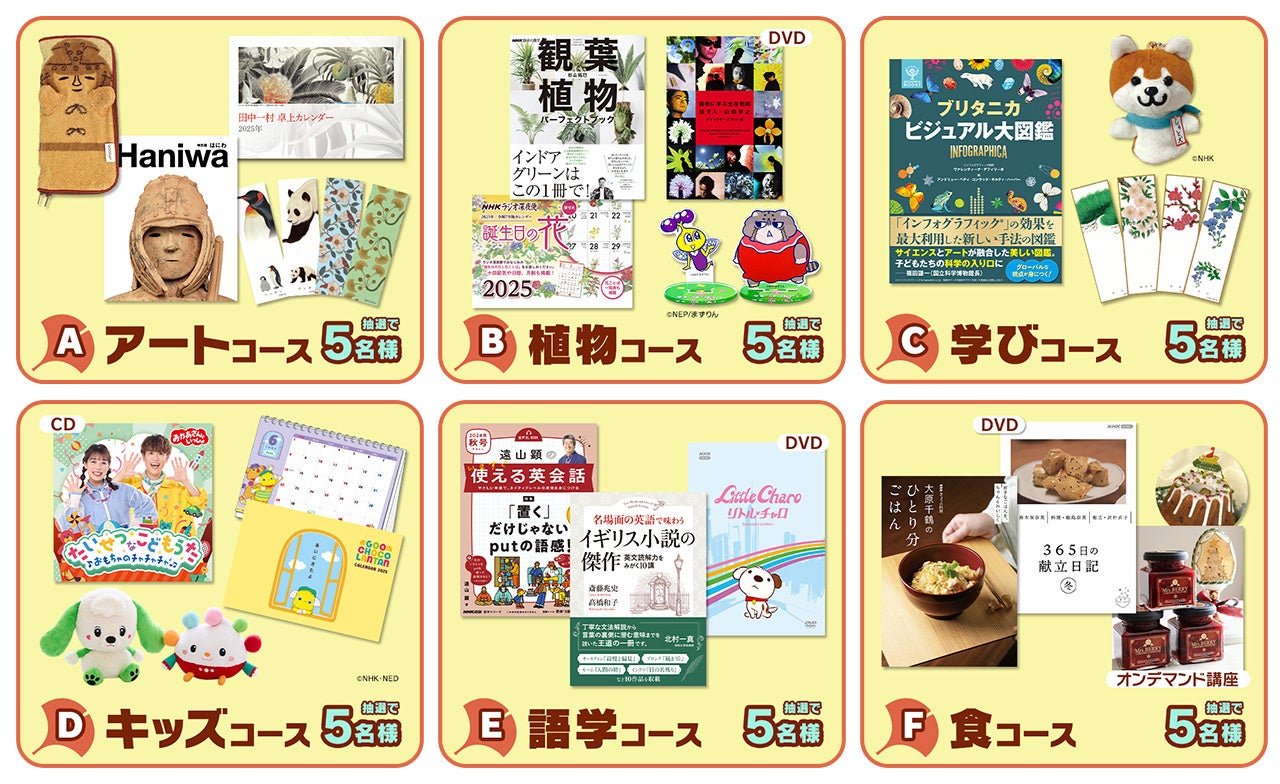 NHKグループの各サイトを訪れてアンケートにご回答いただいた方の中から抽選で30名様に「おかあさんといっしょ」、「しゅと犬くん」、「趣味の園芸」などNHK関連のDVD・書籍・グッズをプレゼントします。