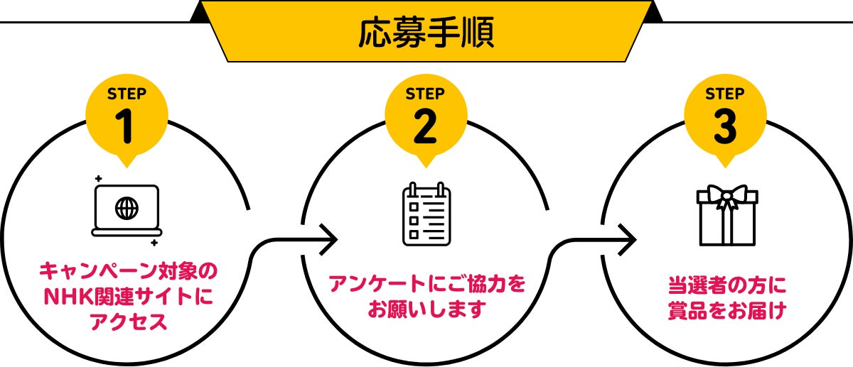 キャンペーン期間中、対象となるNHKグループのサイトを訪れ、アンケートにご回答ください。アンケートに回答していただいた方の中から抽選で30名様にNHK関連の人気商品をプレゼントします。(応募したいコースをアンケートでご選択ください)。