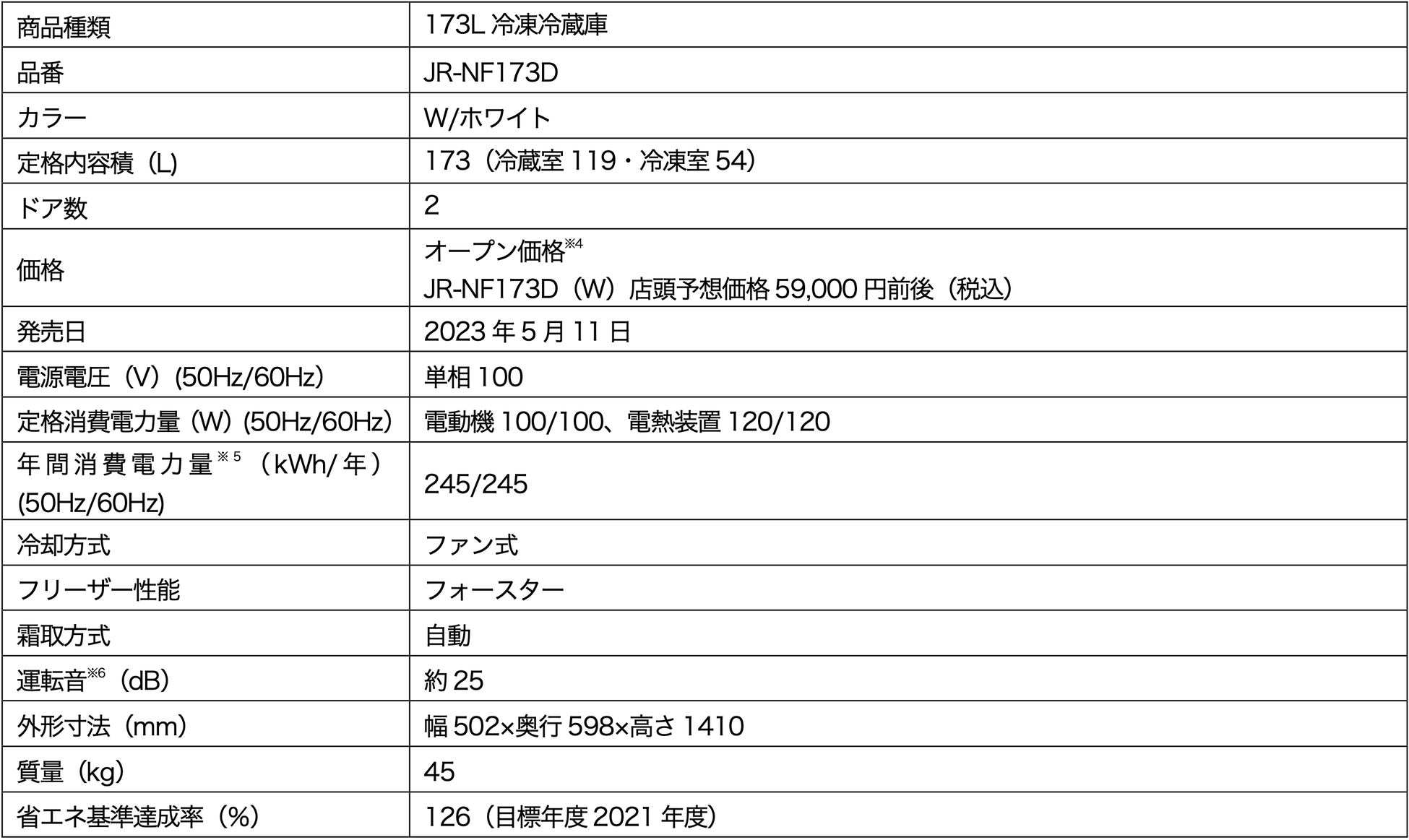 173L冷凍冷蔵庫【JR-NF173D(W)】の概要は以下の通りです。