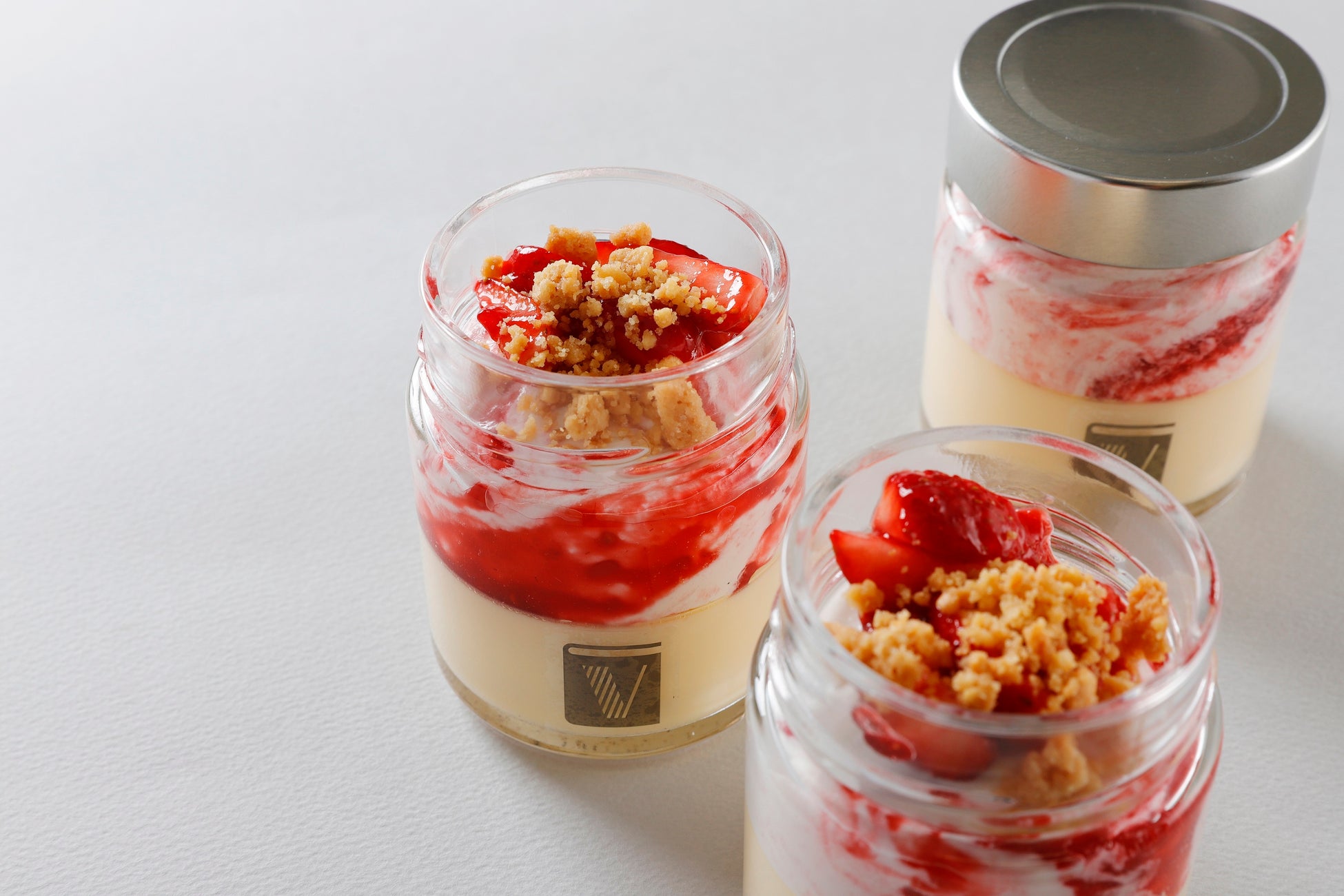 濃厚でなめらかなプリンにチーズクリームといちごソース、さらにいちごをたっぷり飾りました。