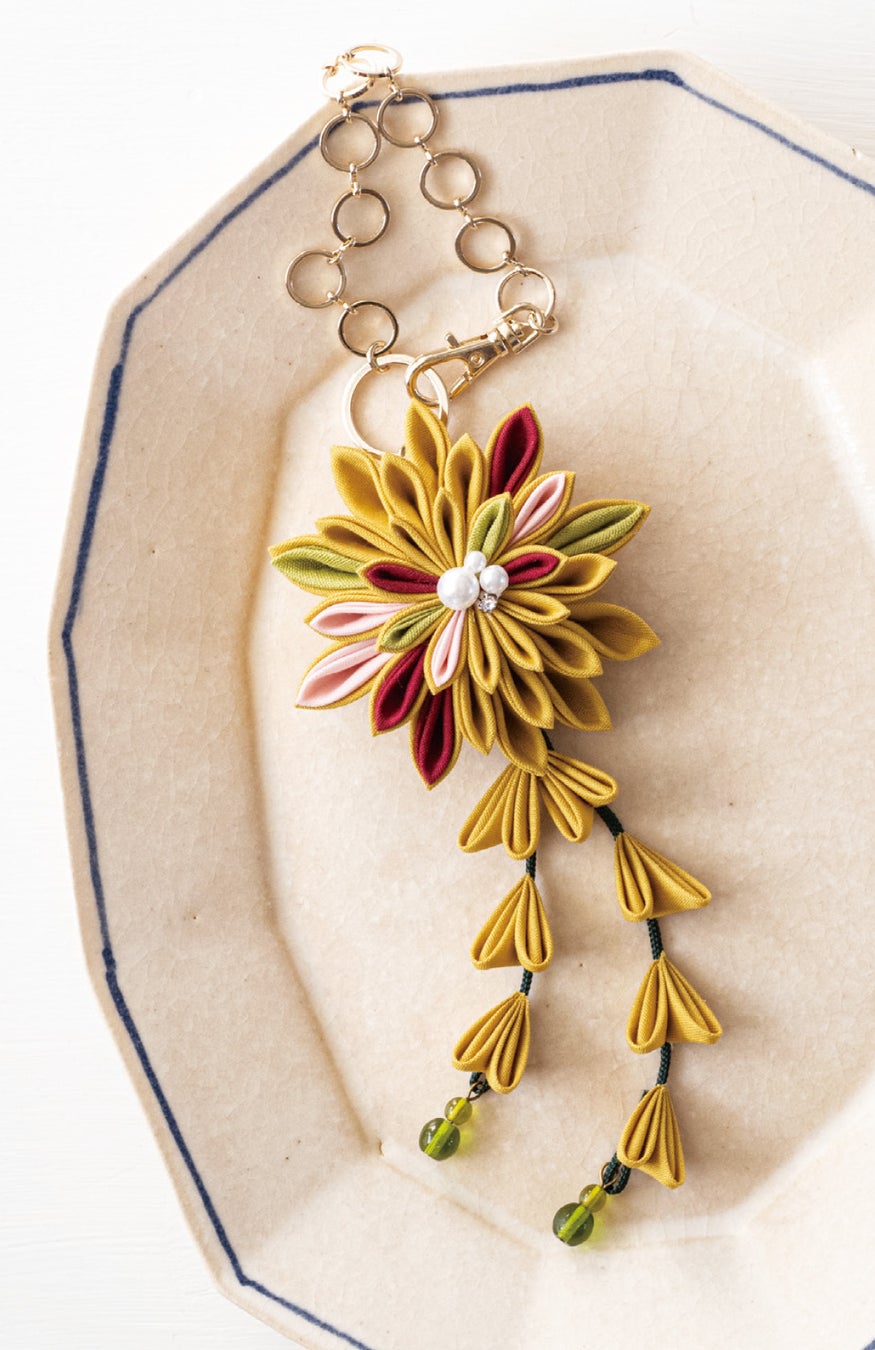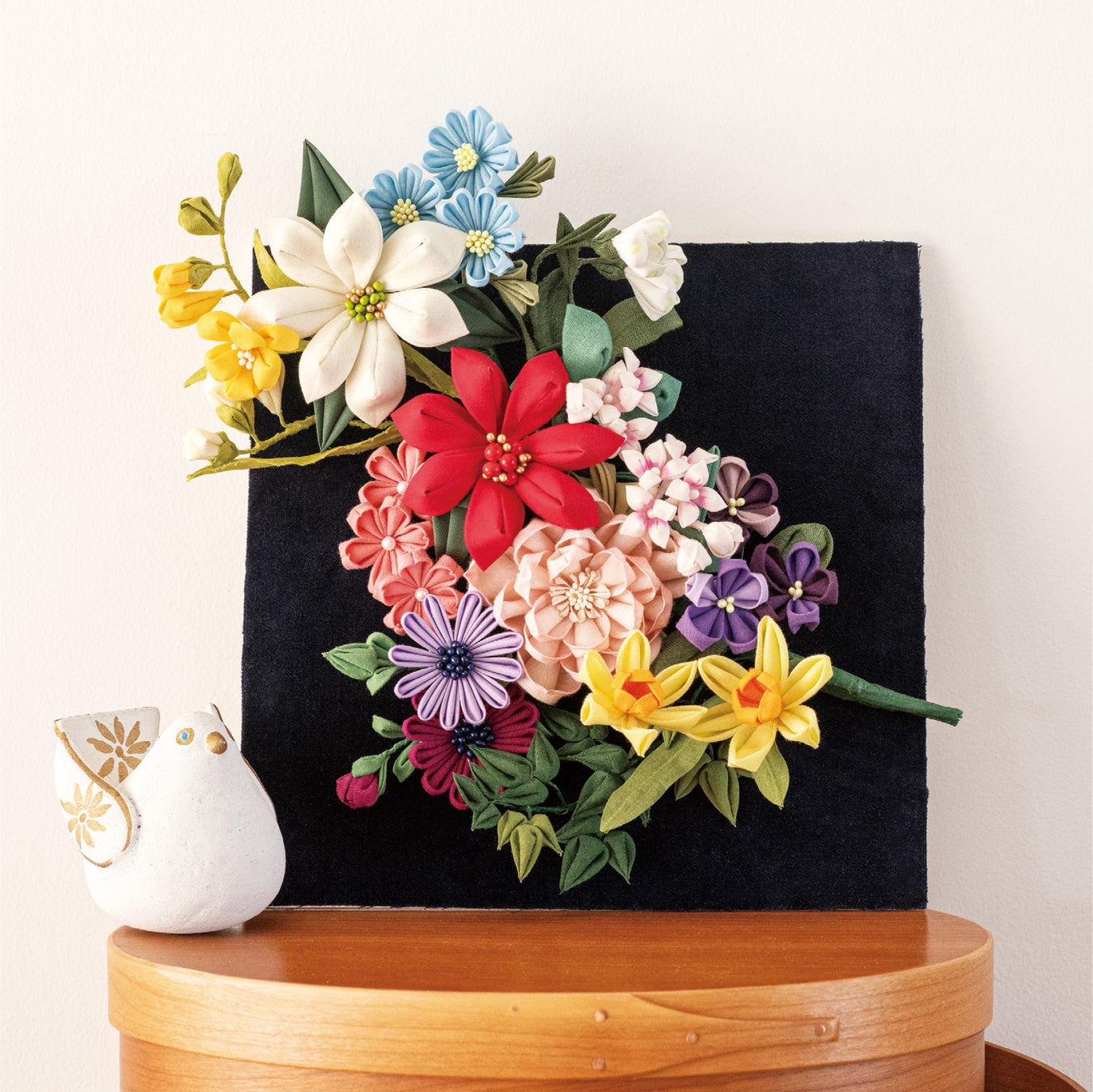 江戸時代から伝わる日本の伝統工芸のひとつである「つまみ細工」。小さい布を折ってつまんで貼る、というその技法で生まれたちりめんの“つまみかんざし”や“花櫛”は、現代でもクラシックな髪飾りとして人気があります。隔週刊『たのしい つまみ細工』では、シリーズを通して技法を学びながら、ちりめんにこだわらない様々な素材や色柄の布で、春・夏・秋・冬の季節のブーケをつなげる「四季のフラワーリース」と、それらのお花をアレンジした和洋さまざまなアクセサリーやインテリア雑貨などを作ります。