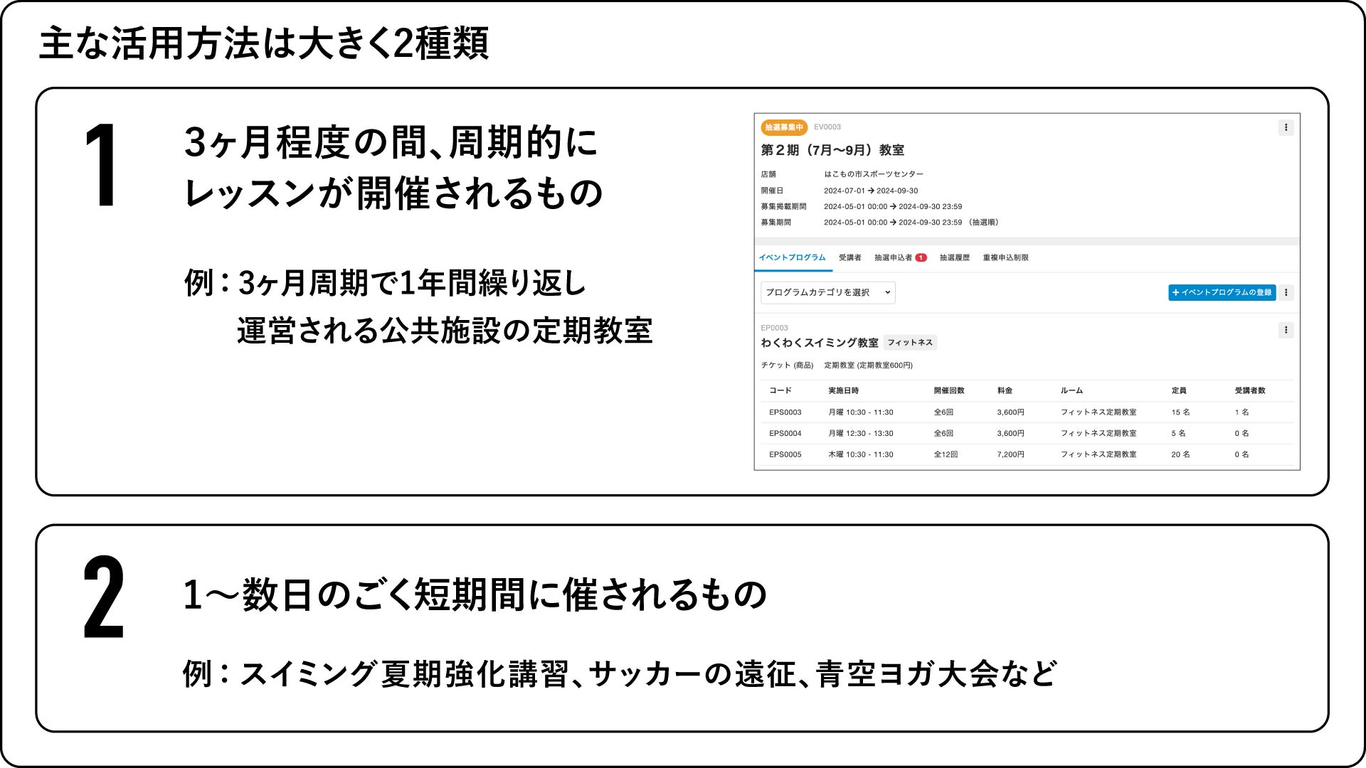 「イベント機能」は、公共施設での定期教室や運動スクールで開催される短期イベントの運営をサポートをする機能です。