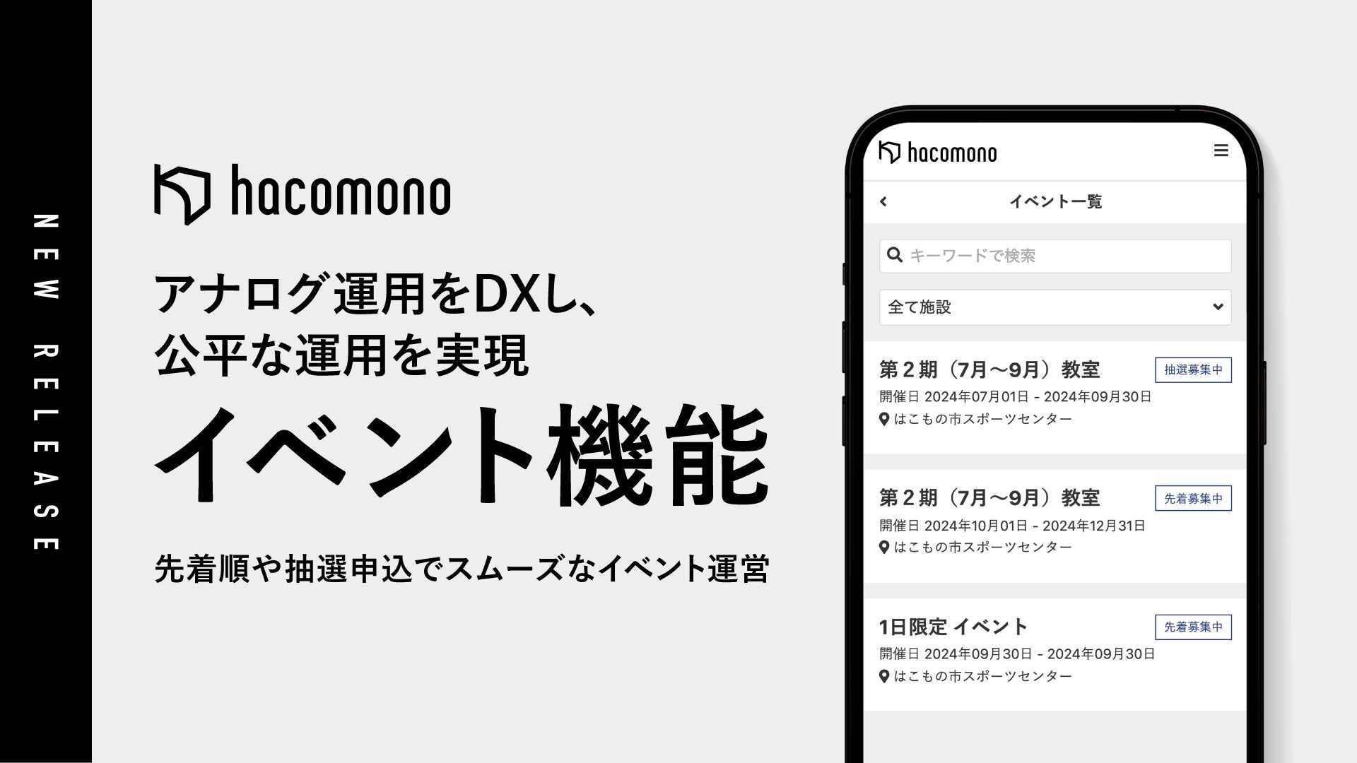 ウェルネス/運動施設向けオールインワン・マネジメントシステム「hacomono」を提供する株式会社hacomono(本社:東京都渋谷区 代表取締役CEO:蓮田健一 以下、hacomono)は、公共施設の定期教室やスイミングスクール、サッカー教室などの短期運動スクールで利用できる「イベント機能」の提供を開始しました。