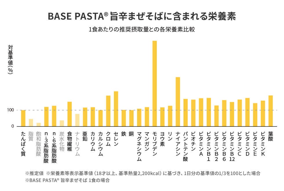 *1 1食分(BASE BREADは2袋、BASE PASTAは1袋、BASE Cookiesは4袋、BASE FOOD Deliは1袋)で、栄養素等表示基準値に基づき、脂質・飽和脂肪酸・炭水化物・ナトリウム以外のすべての栄養素で1日分の基準値の1/3以上を含む